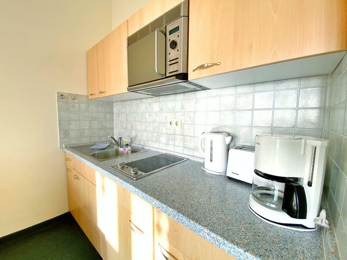 Die Küchenzeile mit Cerankochfeld, Mikrowelle, Kühlschrank mit Gefrierfach, Kaffeemaschine, Toaster und Wasserkocher ist im Wohnbereich integriert. In der Loggia befindet sich der Essplatz mit traumhaftem Blick.