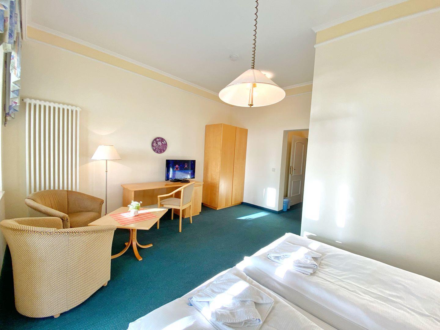 Im kombinierten Wohn-Schlafraum gibt es ein bequemes Doppelbett, eine Couch-Sitzecke und einen Schreibtisch.
