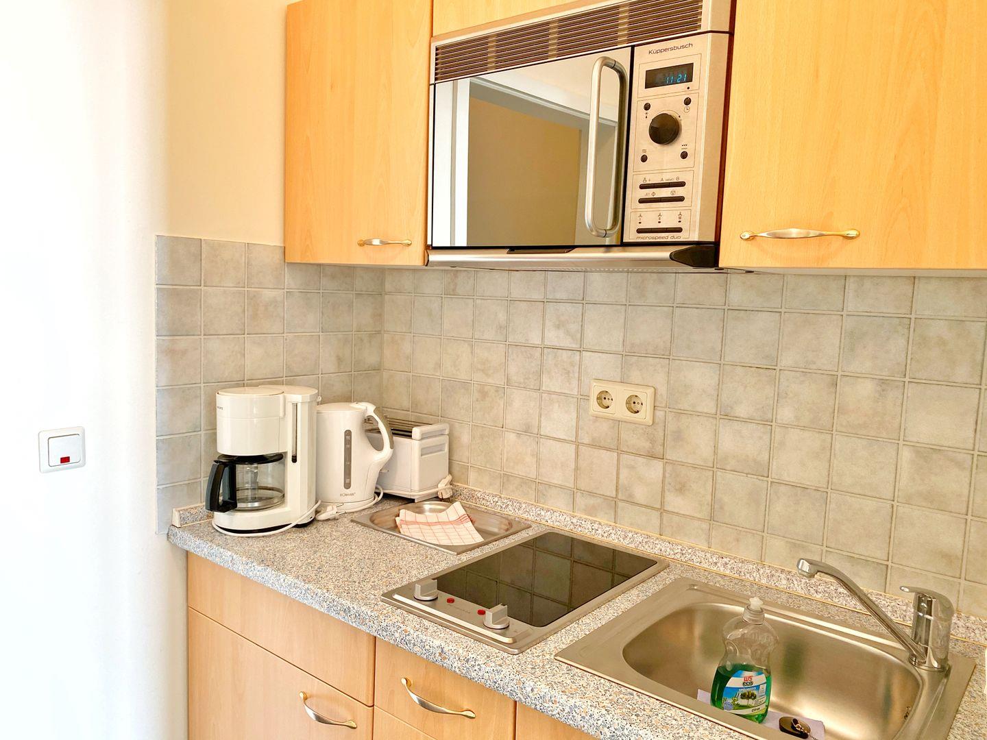Im Eingangsbereich der kleinen Wohnung gibt es eine Küchenzeile mit Cerankochfeld, Mikrowelle, Kühlschrank mit Gefrierfach, Kaffeemaschine, Toaster und Wasserkocher. In der Loggia befindet sich der Essplatz mit herrlichem Ausblick. Das Bad bietet eine Dusche. WLAN ist vorhanden.