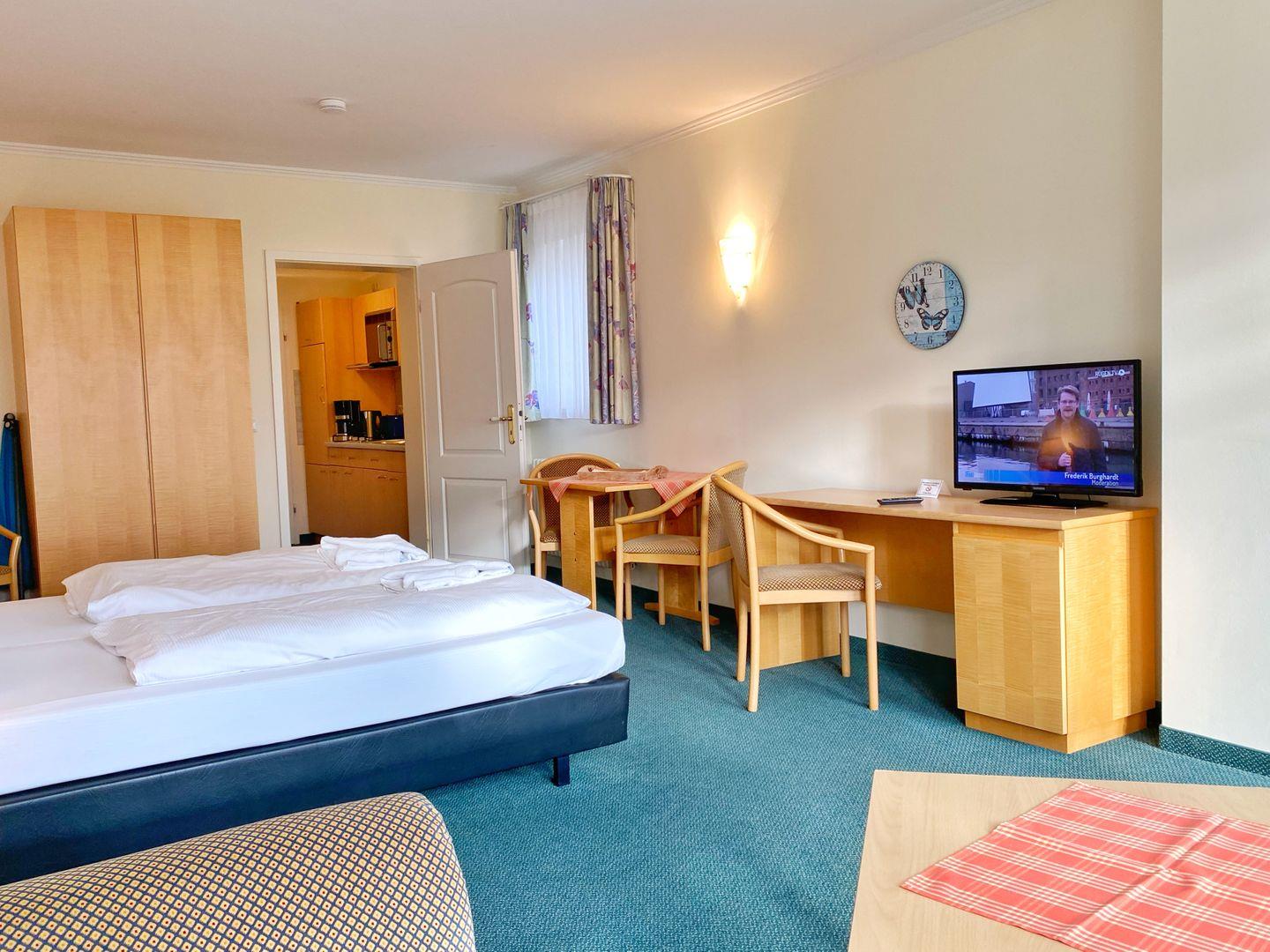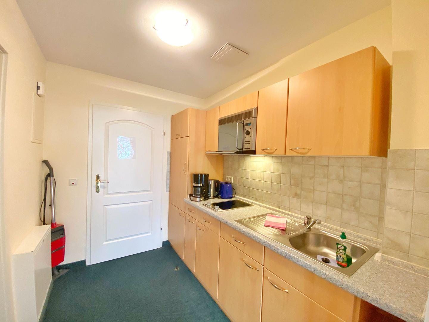 Das 1-Zimmer-Appartement bietet auf 40qm Wohnfläche Platz für 2 Personen. Im kombinierten Wohn-Schlafraum gibt es ein bequemes Doppelbett, eine Couch-Sitzecke, einen kleinen Essplatz und einen Schreibtisch. Im Eingangsbereich der kleinen Wohnung gibt es eine separate Küchenzeile mit Cerankochfeld, Mikrowelle, Kühlschrank mit Gefrierfach, Kaffeemaschine, Toaster und Wasserkocher. Das Bad bietet eine Dusche. WLAN ist vorhanden.