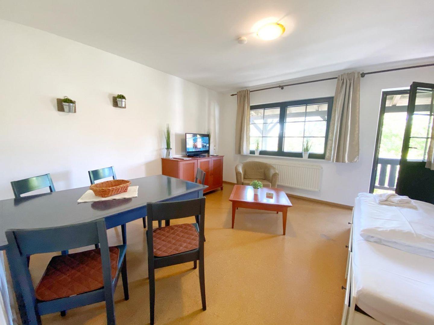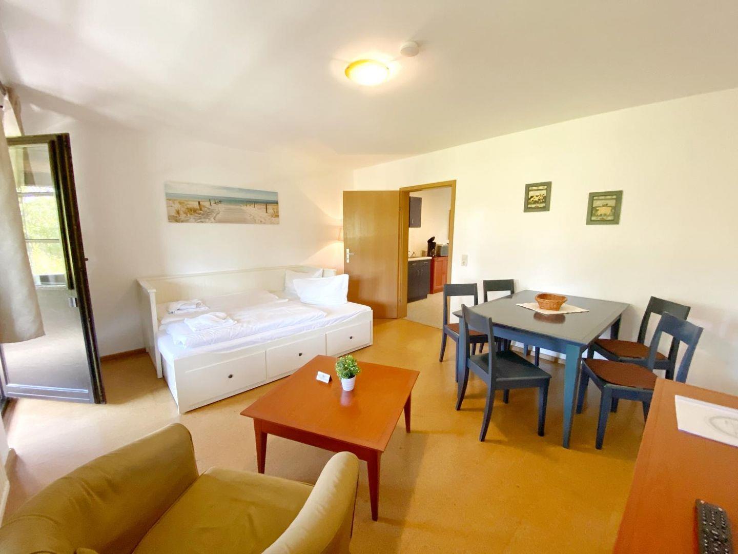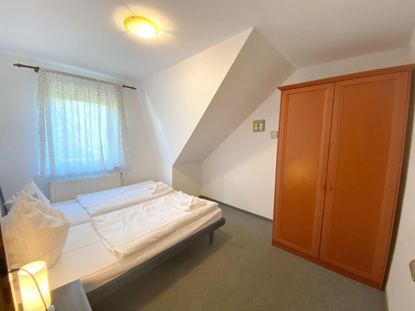 Die gemütliche Ferienwohnung in der ersten Etage ist etwa 40 m² groß und besteht aus einem Wohnraum mit Doppelbettcouch, Esstisch und Flachbildfernseher, einem Schlafzimmer mit Doppelbett, einem Flur und natürlich einem Bad mit Dusche und WC. Die Miniküche des Ferienappartements befindet sich im Flur und ist zweckmäßig mit Geschirr, Besteck, Töpfen, einem 2-Plattenherd, einem Kühlschrank ausgestattet. Zur Wohnung gehören auch Sitzmöglichkeiten auf dem Gemeinschaftsbalkon. Von hier schauen Sie direkt in den Innenhof der Pension. Die Wohnung verfügt über kostenfreies Internet sowie über einen PKW-Stellplatz.