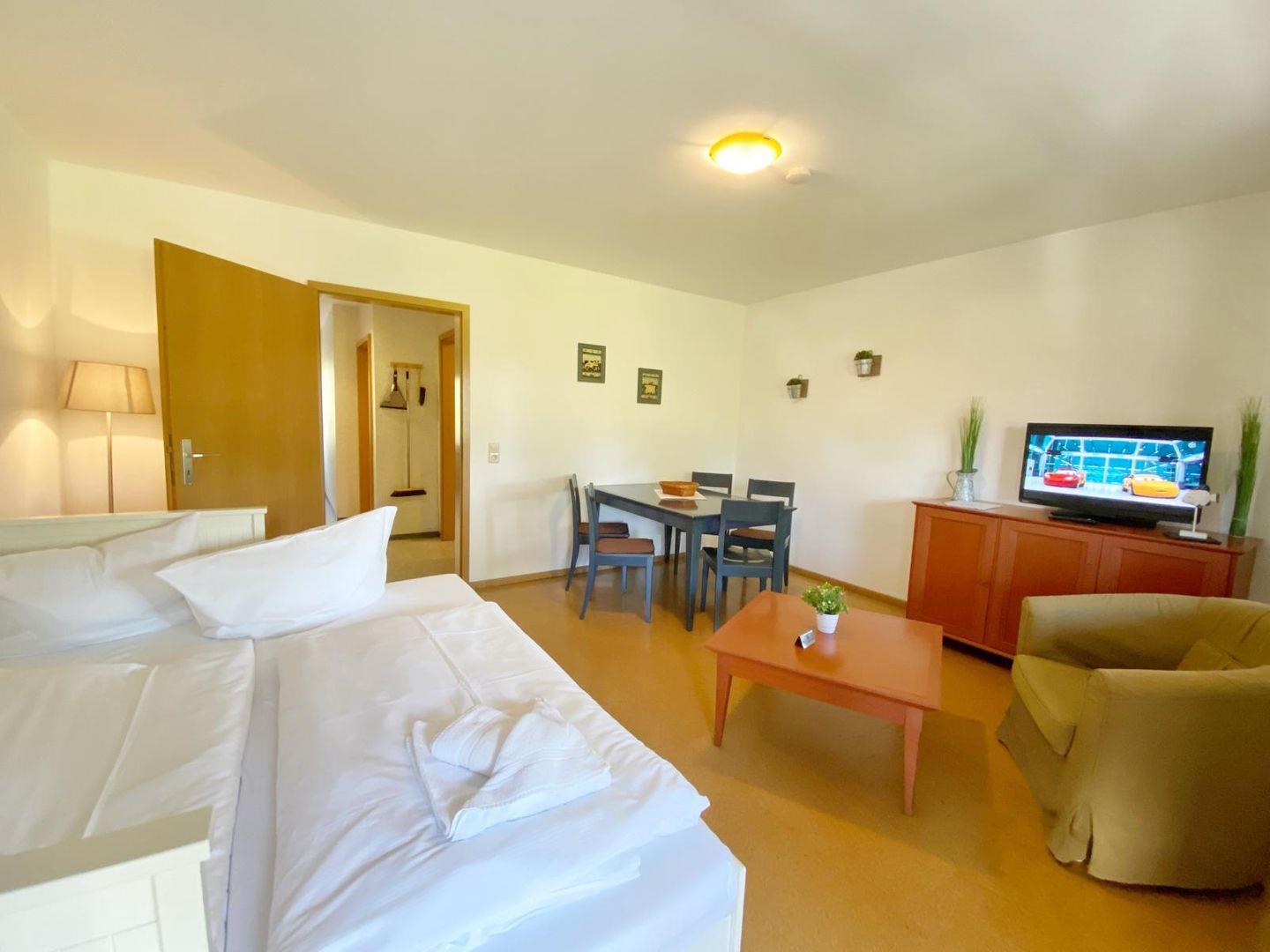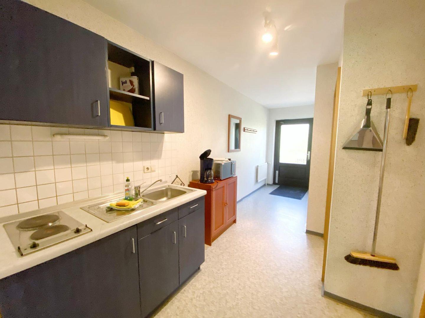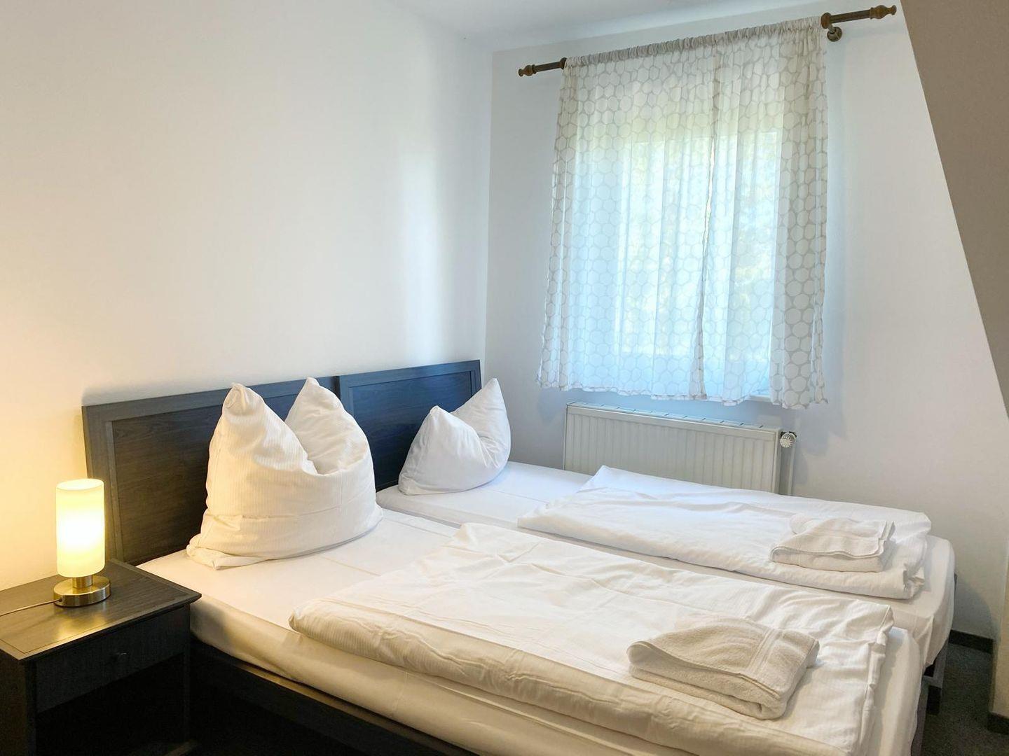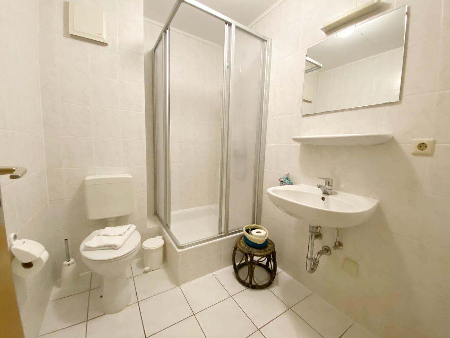 Die gemütliche Ferienwohnung in der ersten Etage ist etwa 40 m² groß und besteht aus einem Wohnraum mit Doppelbettcouch, Esstisch und Flachbildfernseher, einem Schlafzimmer mit Doppelbett, einem Flur und natürlich einem Bad mit Dusche und WC. Die Miniküche des Ferienappartements befindet sich im Flur und ist zweckmäßig mit Geschirr, Besteck, Töpfen, einem 2-Plattenherd, einem Kühlschrank ausgestattet. Zur Wohnung gehören auch Sitzmöglichkeiten auf dem Gemeinschaftsbalkon. Von hier schauen Sie direkt in den Innenhof der Pension. Die Wohnung verfügt über kostenfreies Internet sowie über einen PKW-Stellplatz.