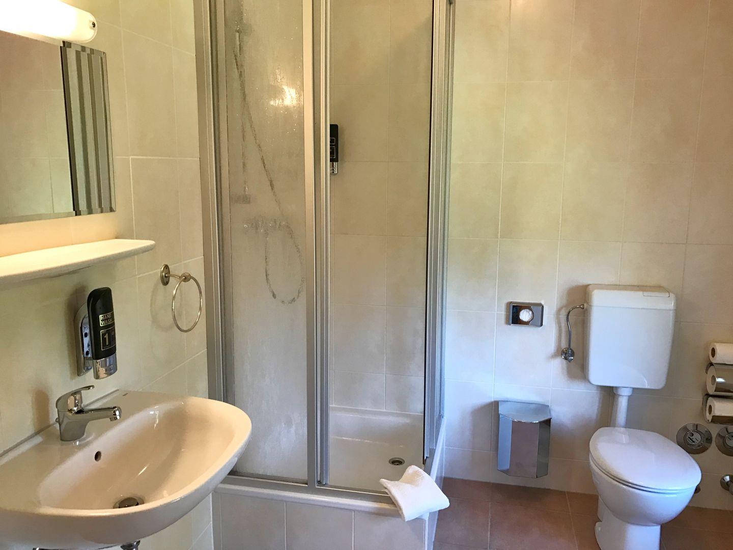 - Dusche mit fest installiertem Duschgel- Shampoo-Spender