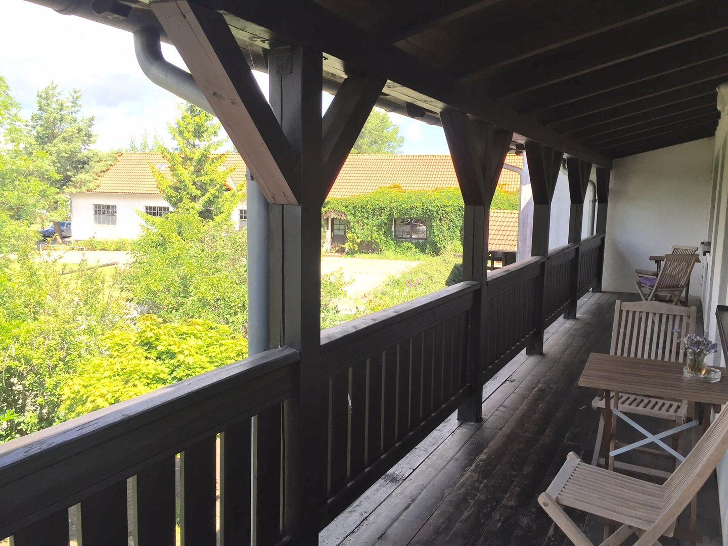 Die Wohnung befindet sich im Obergeschoss und verfügt über einen großen Gemeinschaftsbalkon mit Sitzgelegenheiten.