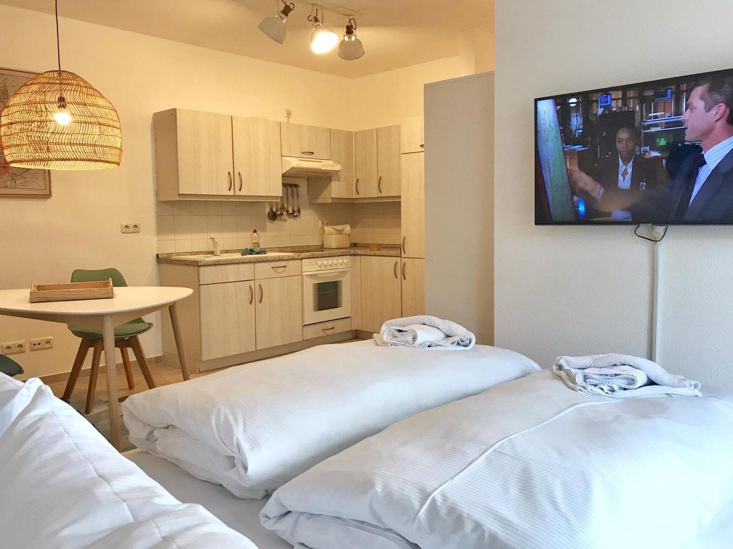 Das Appartement besteht aus einem kombinierten Wohn-Schlafraum, einem Bad, Abstellraum und Balkon. Es bietet Platz für 1-2 Personen. Im Wohn-Schlafzimmer mit Doppelbett ist eine Einbauküche integriert, ein kleiner Essplatz sowie eine gemütliche Couch. Vor dem Wohnbereich gibt es einen Balkon Richtung Süd-West. Das Bad mit Dusche hat ein großes Fenster. Die Abstellkammer bietet ausreichend Stauraum, ebenso der Flur.