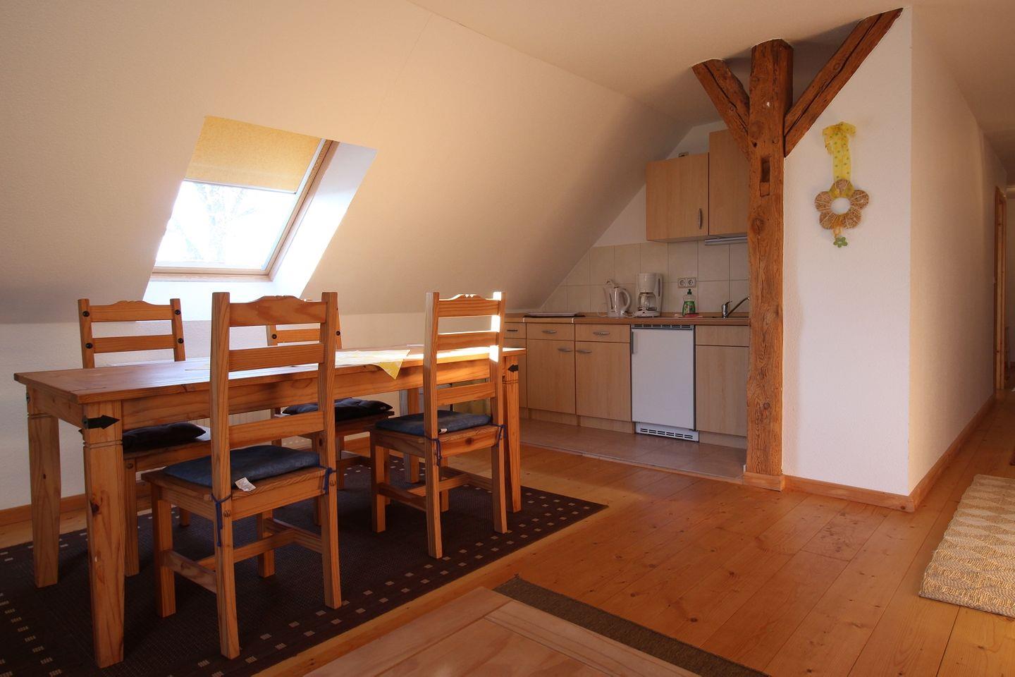 -Der geräumige Holztisch mit vier Stühlen befindet sich direkt unter einem weiteren Dachschrägenfenster, so dass Sie dort gemütlich sitzen und essen können.
