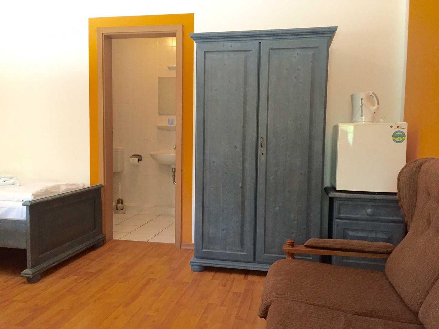 Das komfortable Doppelzimmer befindet sich straßenseitig im Erdgeschoss und ist etwa ca. 25 m² groß. Es verfügt über eine einfache Ausstattung und gliedert sich in ein Badezimmer mit Dusche und WC und einen kombinierten Wohn- und Schlafraum mit 2 einzeln stehenden Betten, einem Esstisch mit 2 Stühlen, einem kleinen Kühlschrank und einem Flachbildfernseher. Das gemütliche Zimmer hat einen kostenfreien Internetzugang und einen PKW-Stellplatz.
