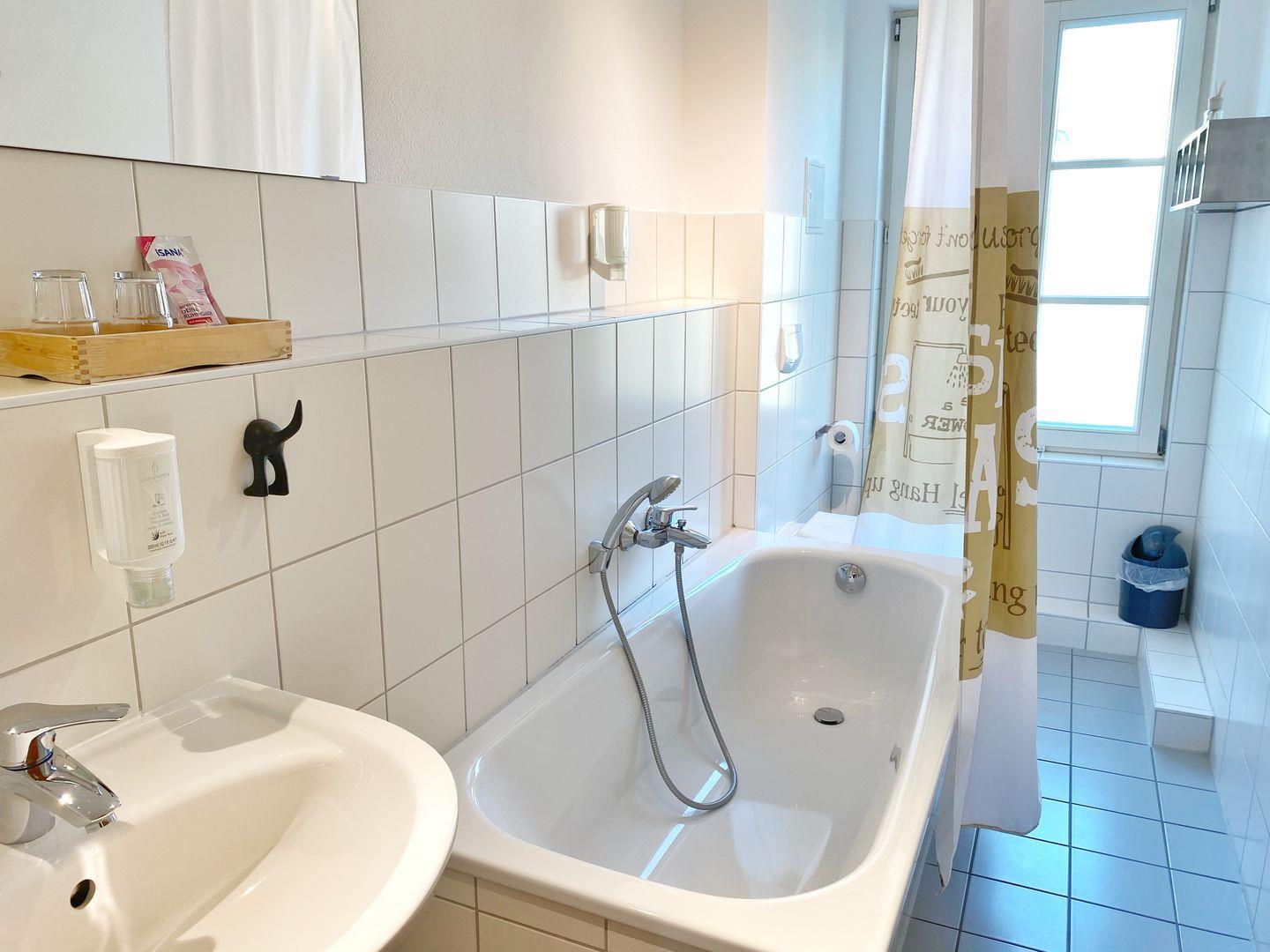 Raumaufteilung: Wohnraum, Schlafzimmer, Küche, Bad mit Badewanne und Fön.