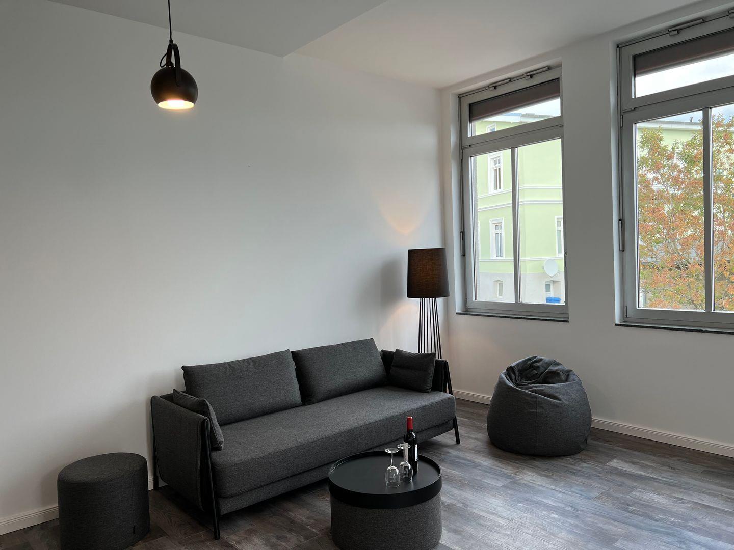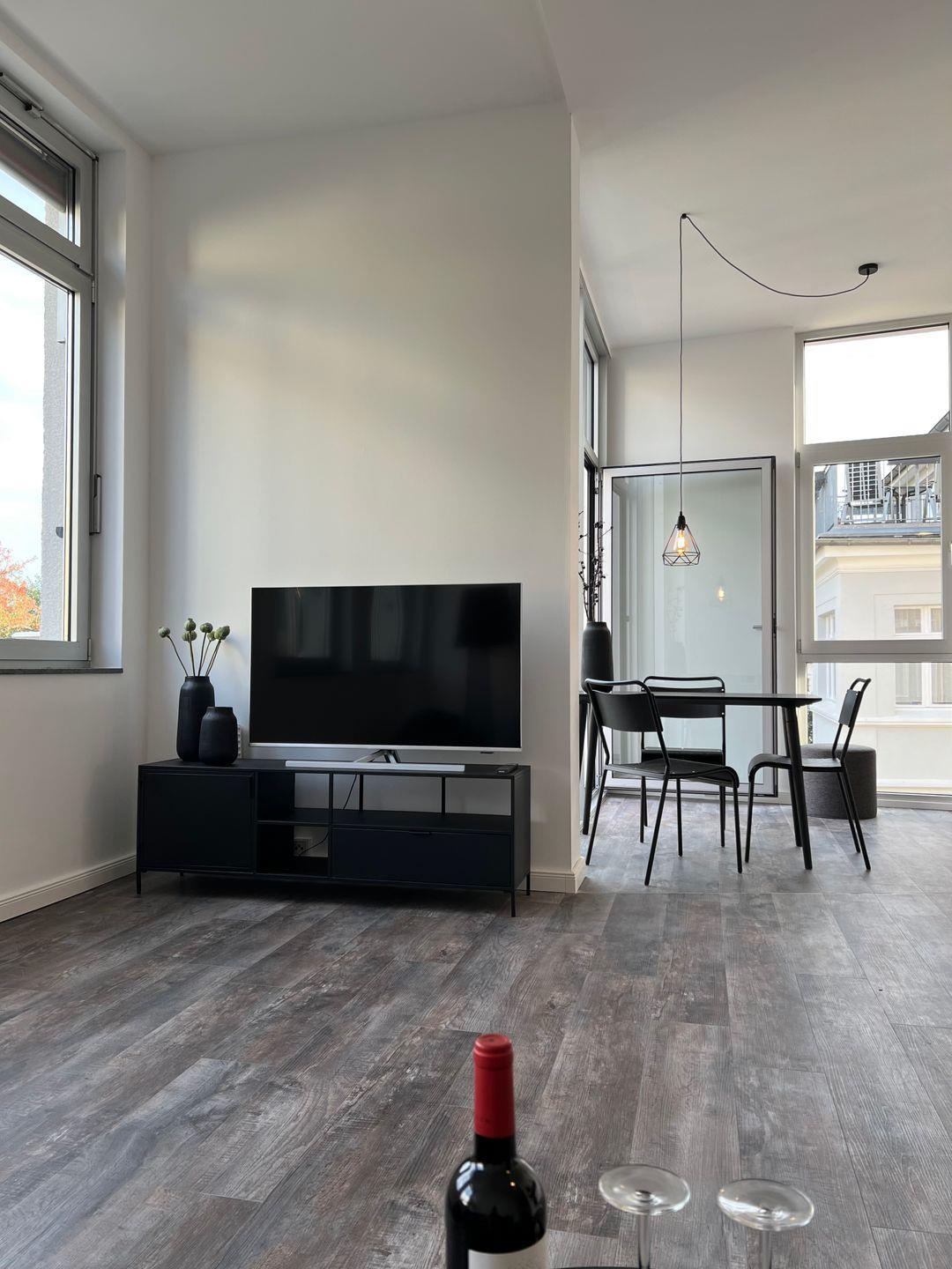Der großzügige Wohn- und Essbereich ist mit einem Sofa sowie einem Esstisch (120 cm x 70 cm) ausgestattet. Für einen gemütlichen Fernsehabend steht ein 50“ Fernseher mit Kabelanschluss für dich bereit. Auch deinen Netflix-Account kannst du darauf nutzen. In der gesamten Wohnung stellen wir dir selbstverständlich kostenlos einen schnellen, kabellosen Internetzugang zur Verfügung.