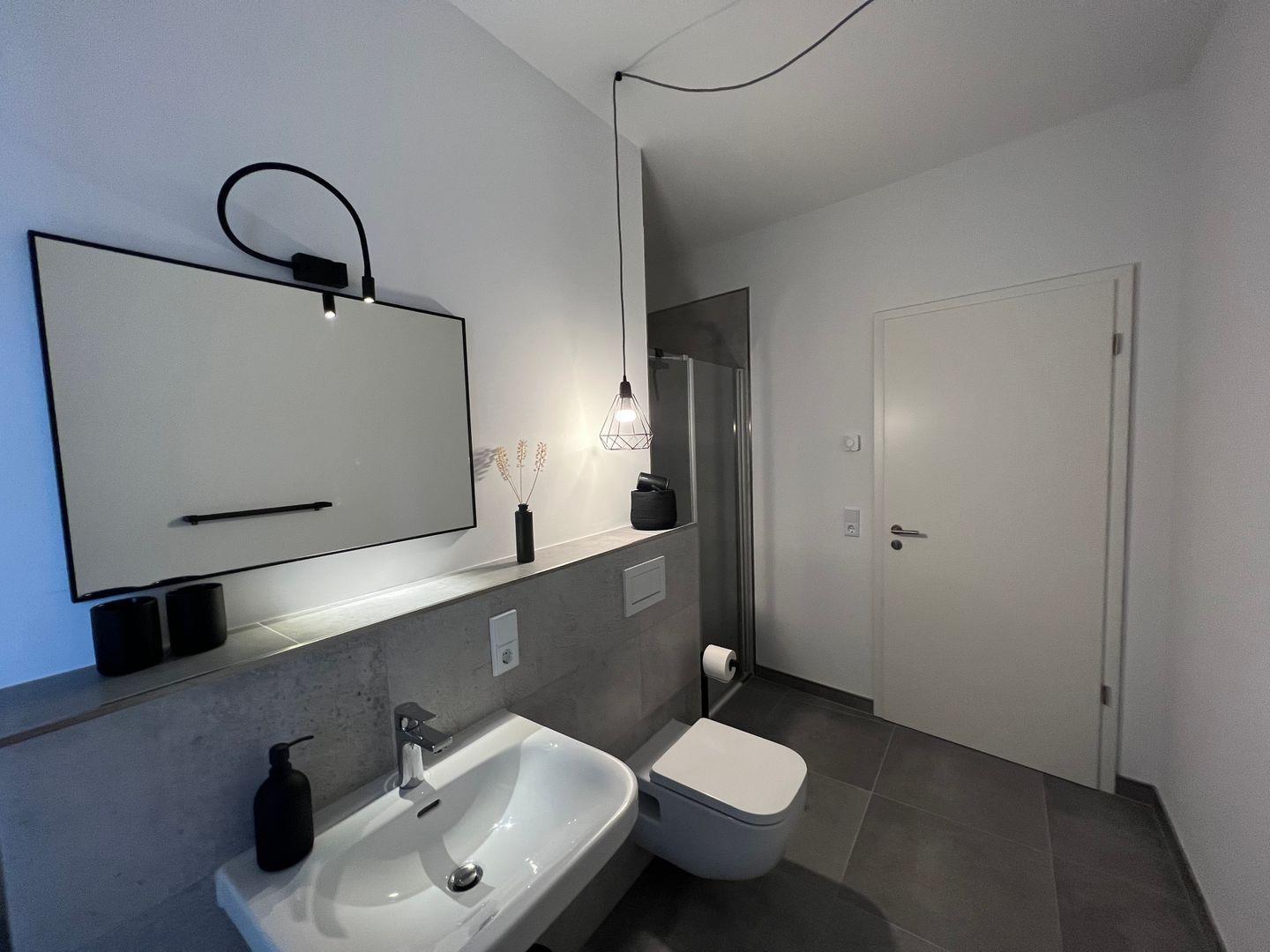 Das moderne Badezimmer mit Fußbodenheizung und Dusche bietet ausreichend Ablagemöglichkeiten für deine persönlichen Kosmetikprodukte. Handtücher, einen Haartrockner und Körperpflegeprodukte bekommst du von uns gestellt.