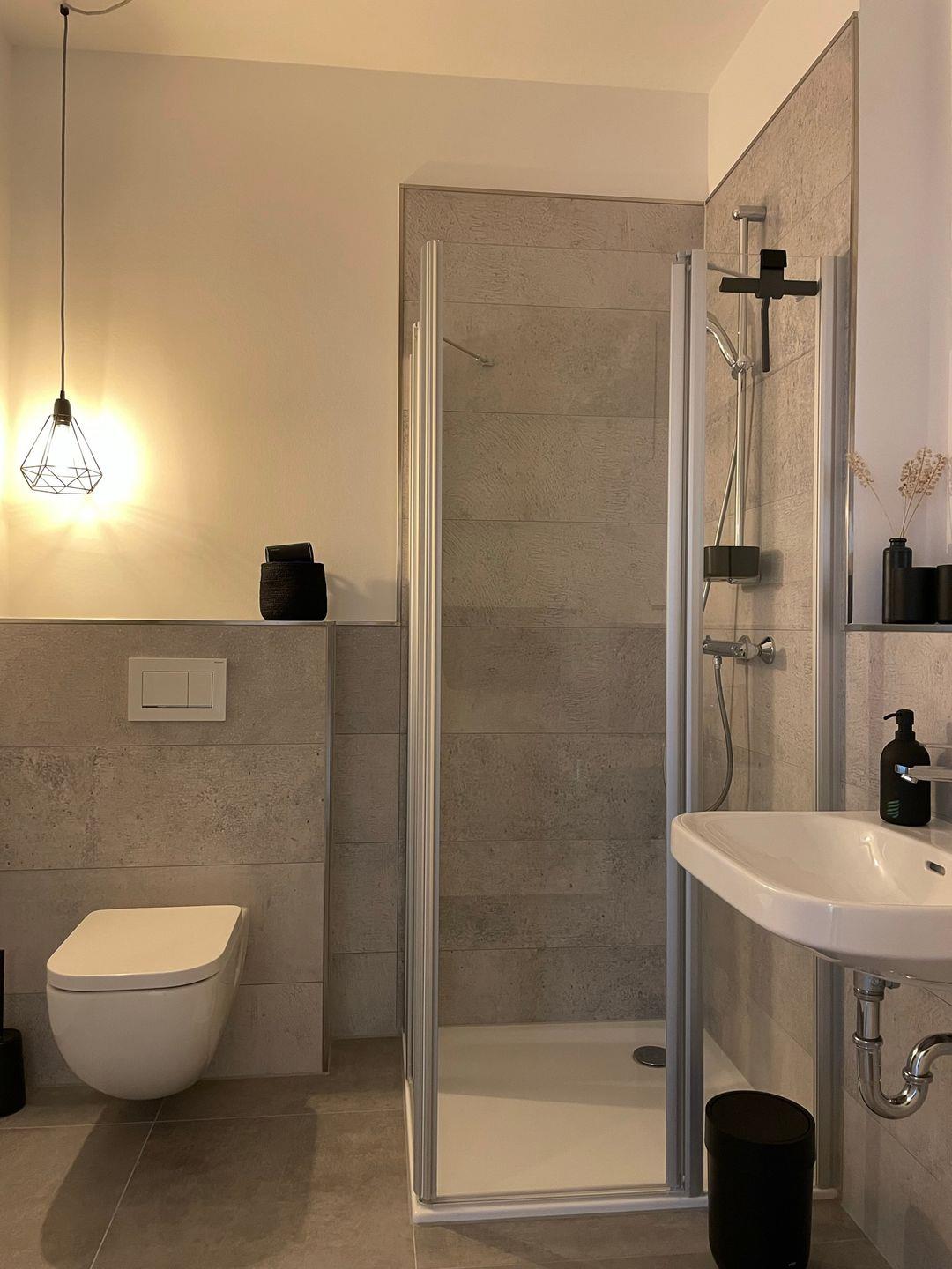 Das moderne Badezimmer mit Fußbodenheizung und Dusche bietet ausreichend Ablagemöglichkeiten für deine persönlichen Kosmetikprodukte. Handtücher, einen Haartrockner und Körperpflegeprodukte bekommst du von uns gestellt.