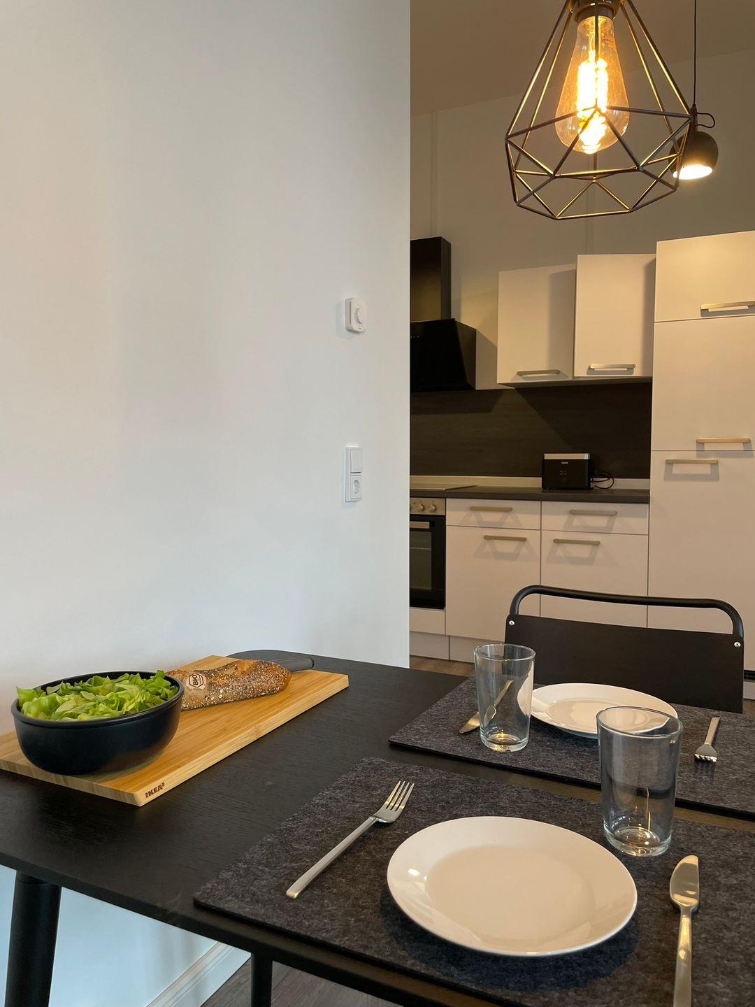 Der großzügige Wohn- und Essbereich ist mit einem Sofa sowie einem Esstisch (120 cm x 70 cm) ausgestattet. Für einen gemütlichen Fernsehabend steht ein 50“ Fernseher mit Kabelanschluss für dich bereit. Auch deinen Netflix-Account kannst du darauf nutzen. In der gesamten Wohnung stellen wir dir selbstverständlich kostenlos einen schnellen, kabellosen Internetzugang zur Verfügung.