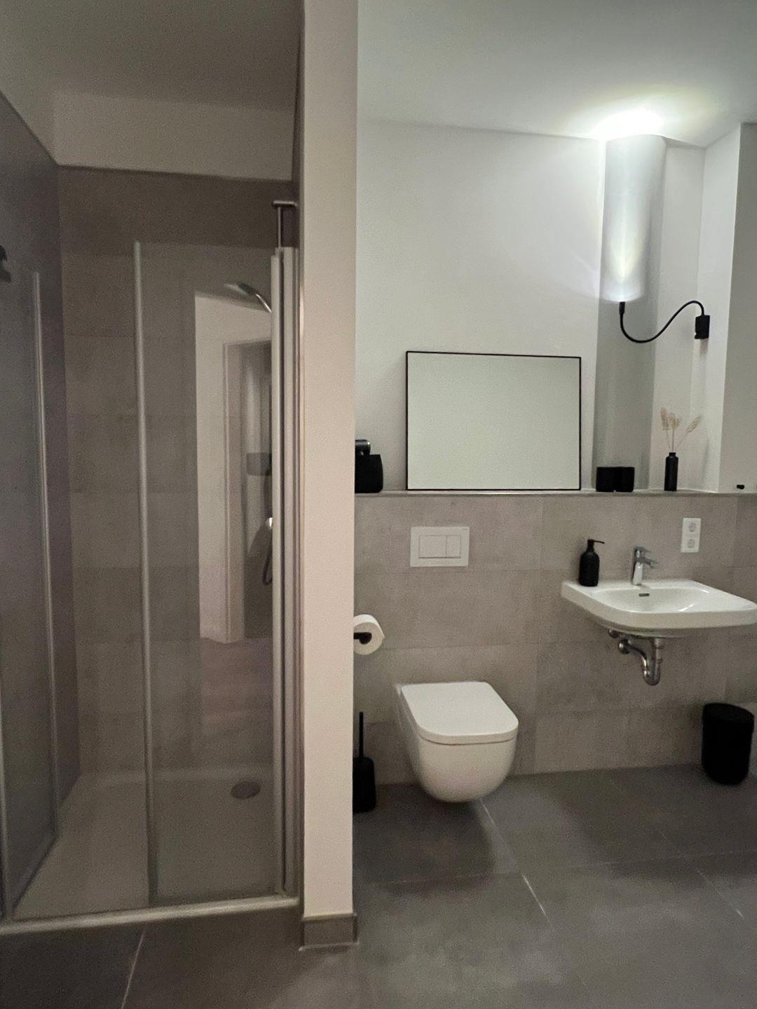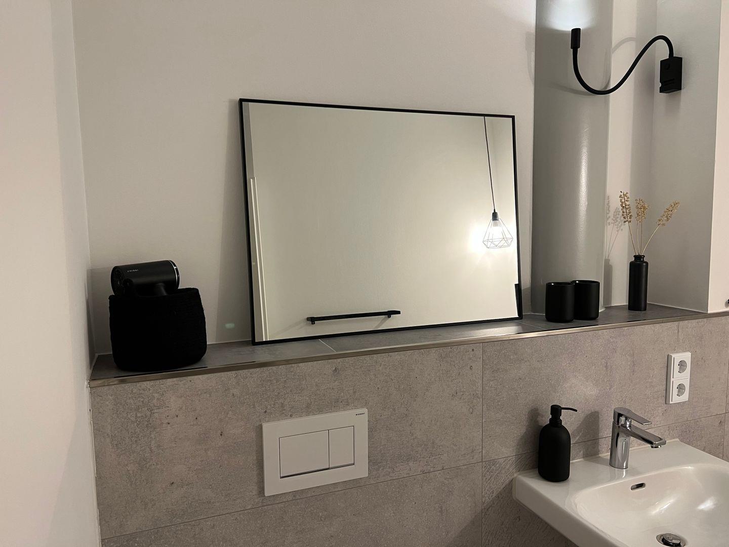 Das moderne Badezimmer mit Fußbodenheizung und Dusche bietet ausreichend Ablagemöglichkeiten für deine persönlichen Kosmetikprodukte. Handtücher, einen Haartrockner und Körperpflegeprodukte bekommst du von uns gestellt.