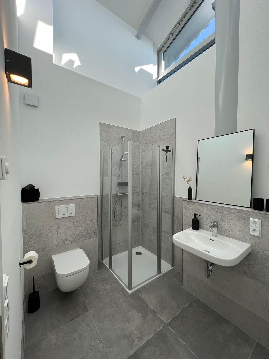 Das moderne Badezimmer mit Fußbodenheizung und Dusche bietet ausreichend Ablagemöglichkeiten für deine persönlichen Kosmetikprodukte. Handtücher, einen Haartrockner und Körperpflegeprodukte bekommst du von uns gestellt.
