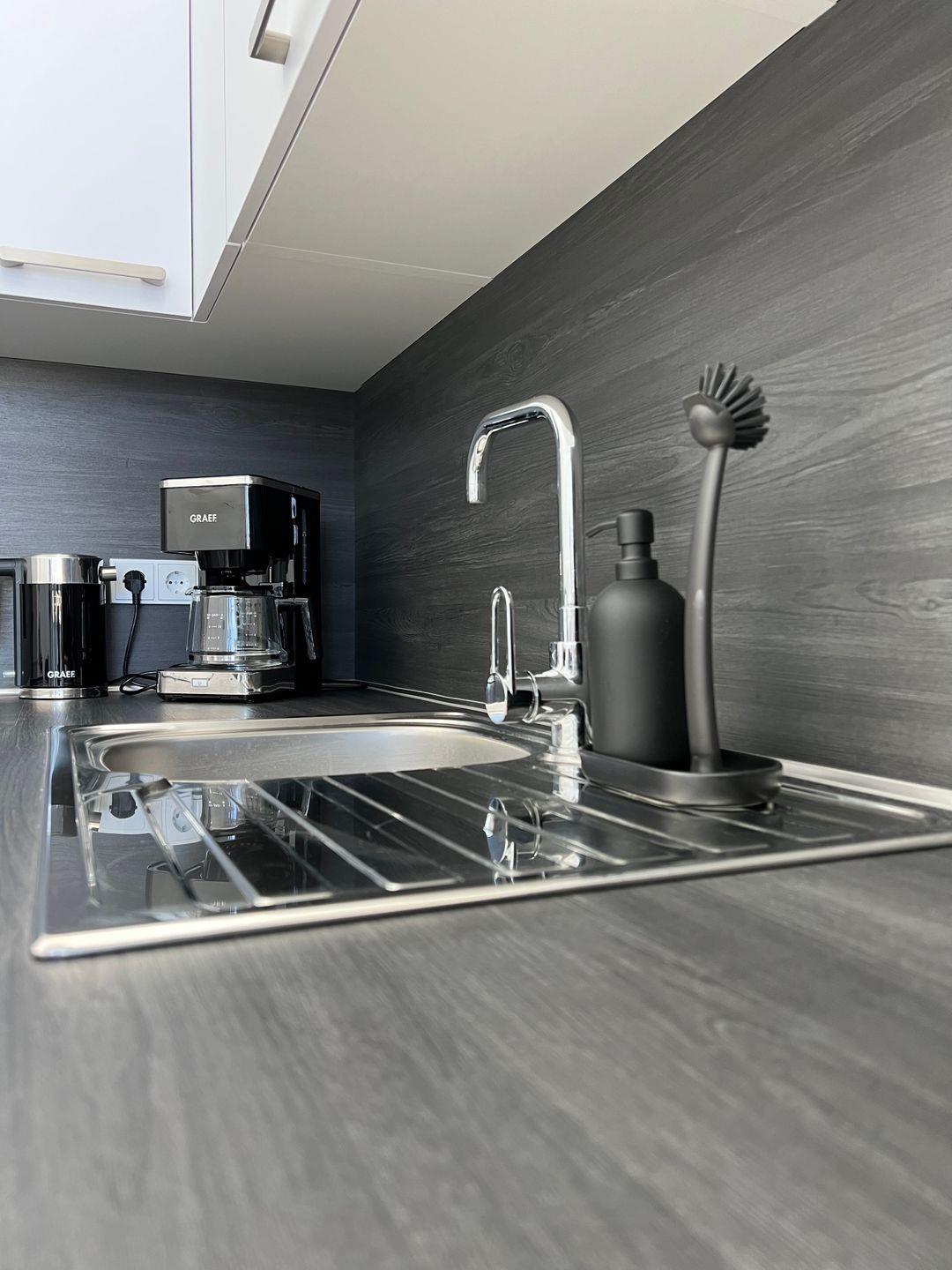 In der hochwertigen offenen Küche findest du neben einem Kochfeld mit vier Kochplatten einen Backofen sowie einen Kühlschrank mit Gefrierfach und einen Geschirrspüler. Die sorgfältig ausgewählten Küchenutensilien helfen dir beim Kochen und Genießen. Zu unserer Grundausstattung gehören außerdem Salz, Pfeffer und Zucker. Weiterhin stehen dir für dein Frühstück ein Toaster sowie für die Kaffee- und Teezubereitung eine Kaffeemaschine und ein Wasserkocher zur Verfügung.