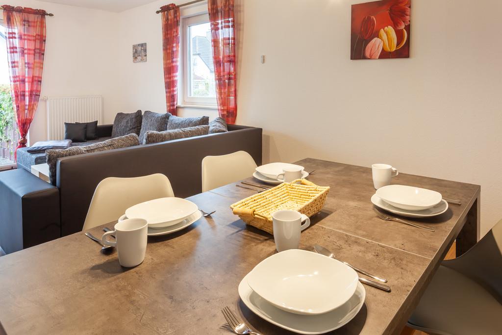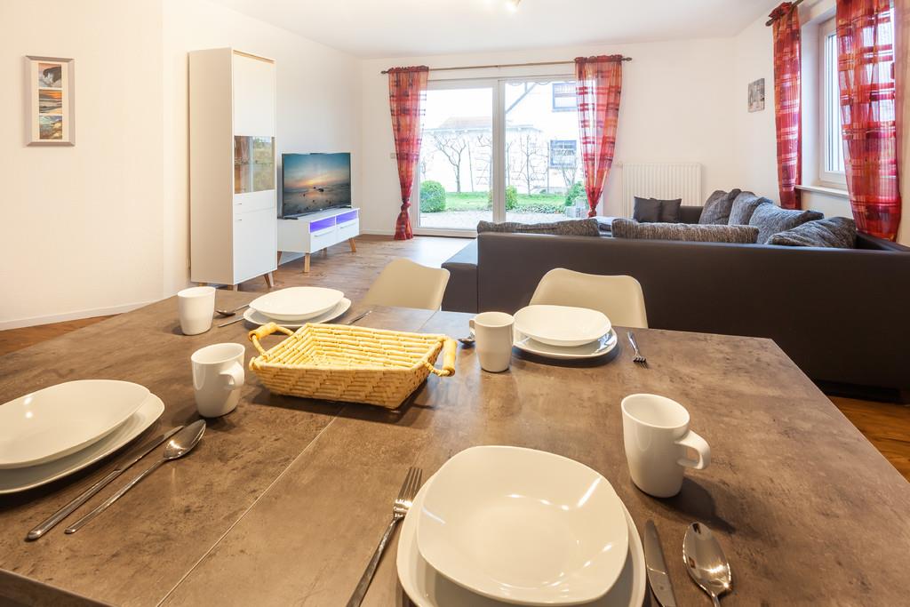 Im Wohnzimmer mit einer Sofa-Landschaft kann ebenfalls noch eine Person übernachten. Auch hier gibt es einen großen Flachbild-TV, außerdem einen großen Esstisch.