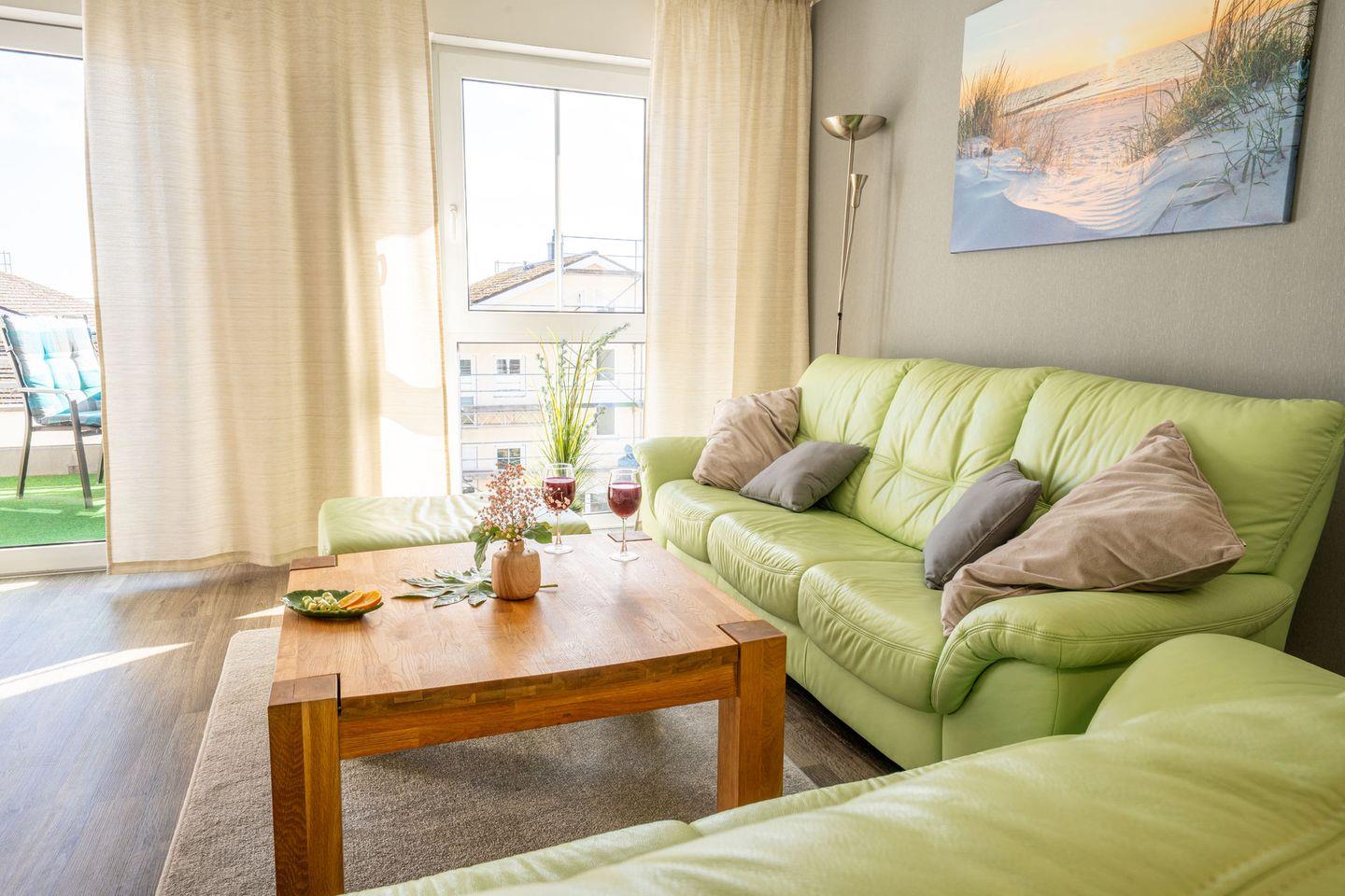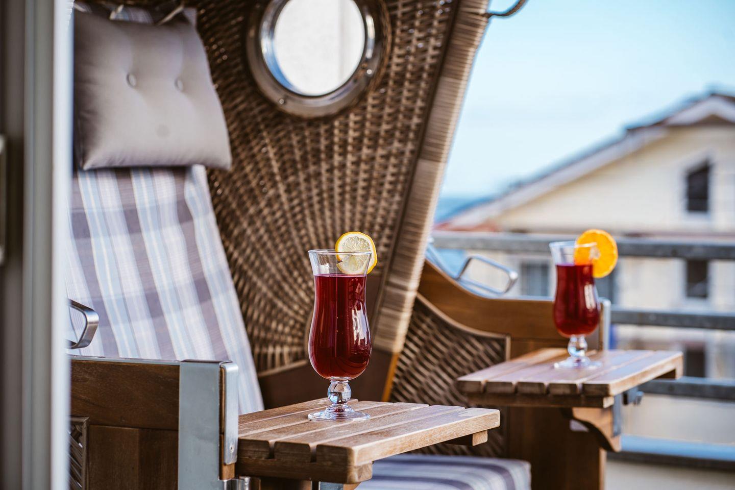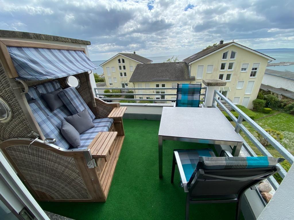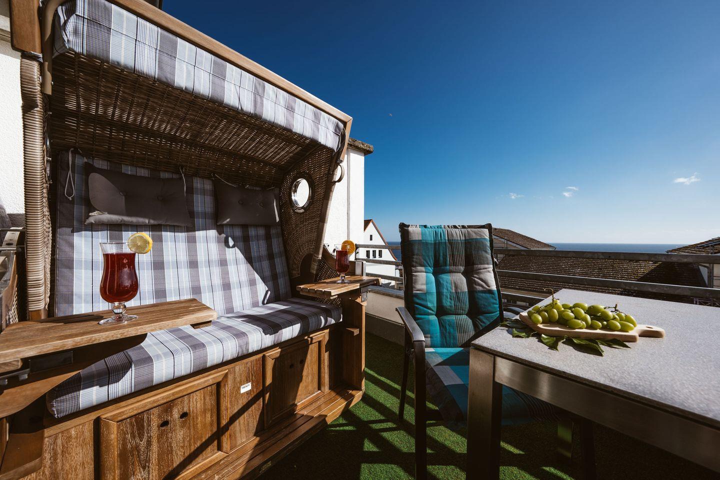 Modernes Penthaus in Sassnitz mit Balkon, Strandkorb und Meerblick für entspannte Urlaubstage.