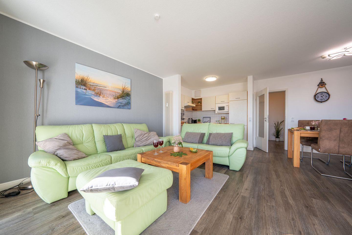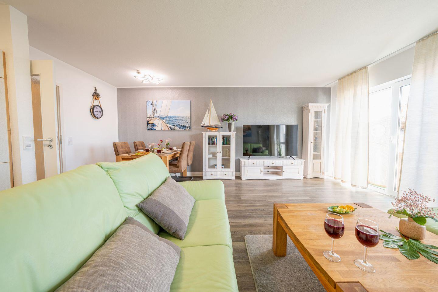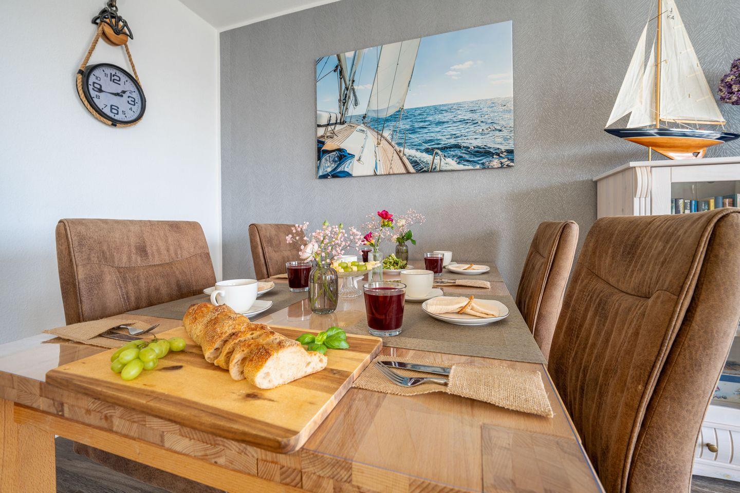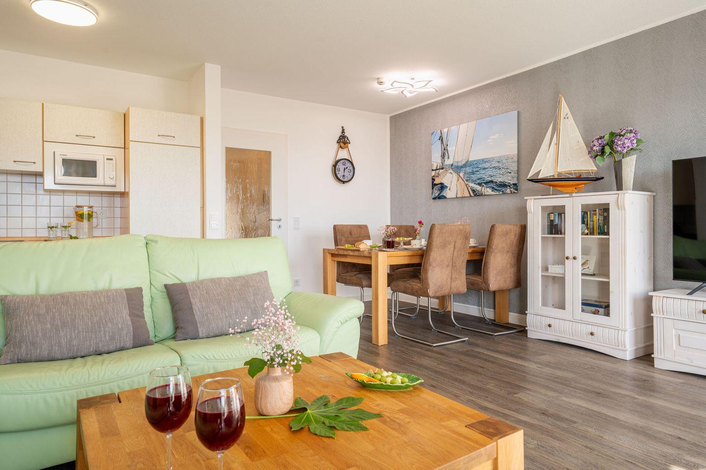 Der helle Wohnbereich ist mit Laminatboden, Sofaecke und Essplatz gestaltet und lädt nach einem Tag am Wasser zum Abschalten ein. Für Unterhaltung und Komfort stehen Ihnen WLAN, zwei TVs (über 55 Zoll) sowie ein Radio zur Verfügung. Sichtschutz an allen Fenstern sorgt dabei jederzeit für Privatsphäre. Die offene Küche ist direkt an das Wohnzimmer angebunden und vollständig ausgestattet – mit Cerankochfeld, Backofen, Mikrowelle, Spülmaschine, Kühlschrank mit Gefrierfach, Kaffeemaschine, Wasserkocher, Toaster sowie reichlich Küchenutensilien, Geschirr und Besteck. Auch an praktische Details wie Geschirrhandtücher und Abfalleimer ist gedacht.