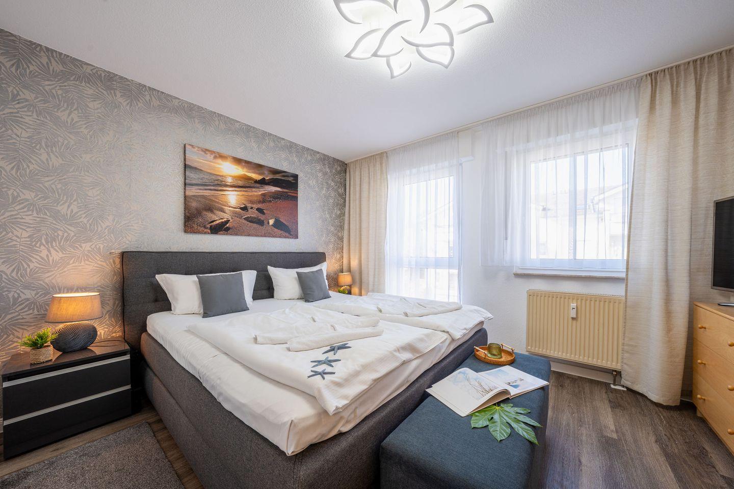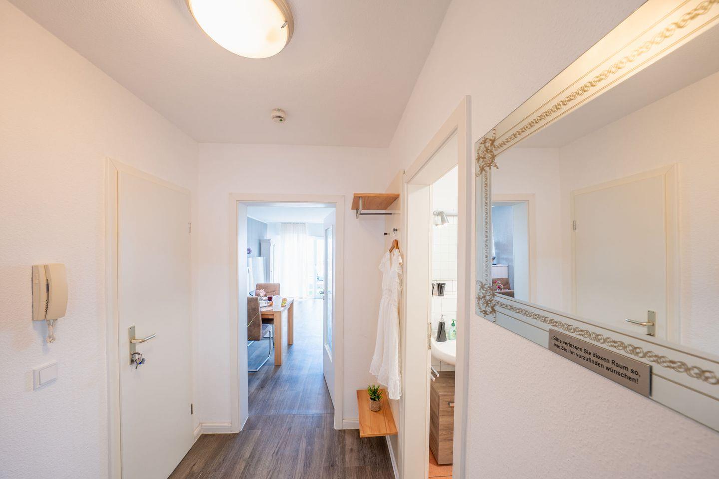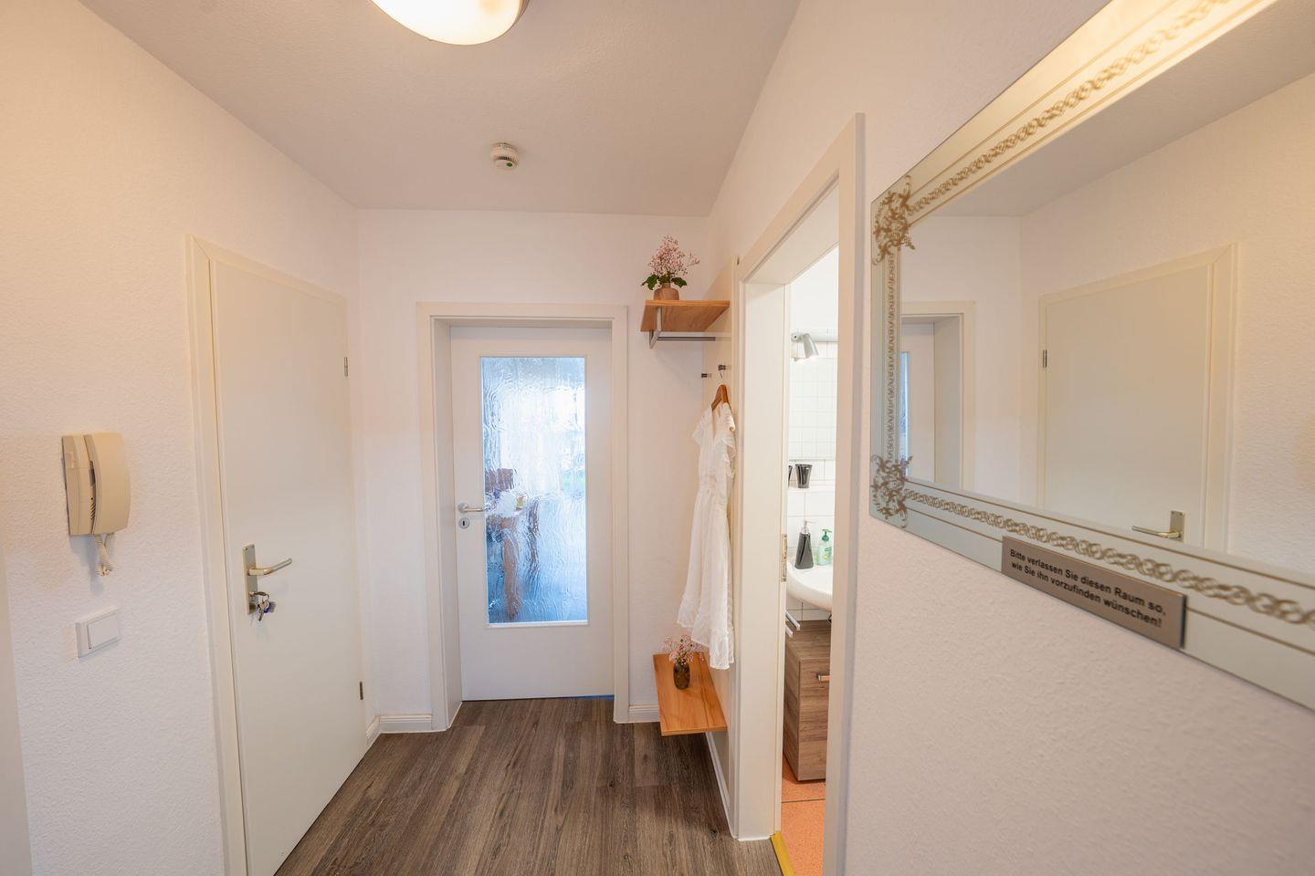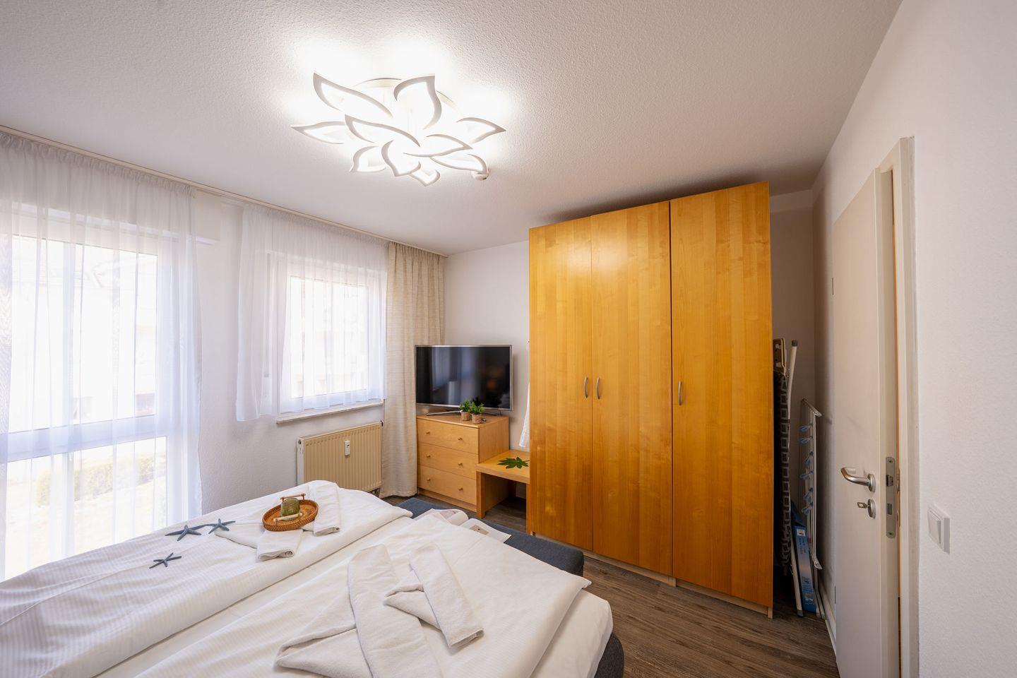 Das separate Schlafzimmer ist ebenfalls mit Laminatboden eingerichtet; zusätzlich stehen Kommode und Garderobe bereit, damit Sie alles bequem verstauen können. Im Badezimmer finden Sie sowohl Dusche als auch Badewanne (Dusche in der Wanne), WC, Waschbecken, Spiegel, warmes Wasser und einen Haartrockner – perfekt für entspannte Morgen oder ein Bad am Abend. Bettwäsche und Handtücher sind vorhanden, ebenso eine Erstausstattung und ein Wäscheservice. Waschmaschine und Trockner können gemeinschaftlich genutzt werden ( kostenpflichtig - Münzautomaten ).