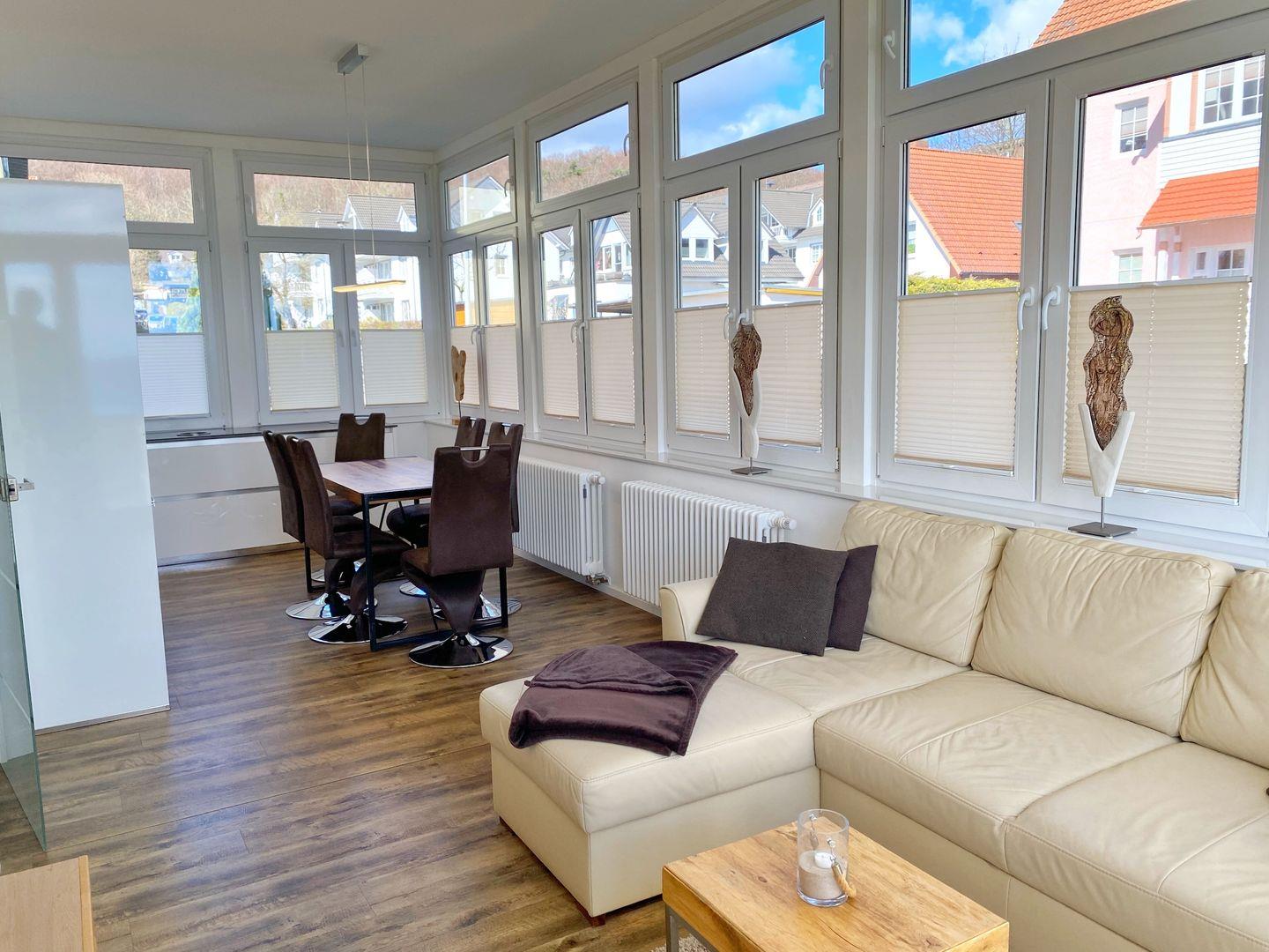 Die Ferienwohnung 1 befindet sich im Hochparterre der Villa "Gössel". Sie hat eine Wohnfläche von ca. 110qm und besteht aus einem Schlafzimmer mit Doppelbett, einem großzügigen Wohnzimmer mit Schlafcouch für zwei weitere Personen, zwei Bädern mit bodengleichen Duschen und einer gemütlichen Wohnküche im Wintergarten mit zusätzler Couch und Sitzecke.