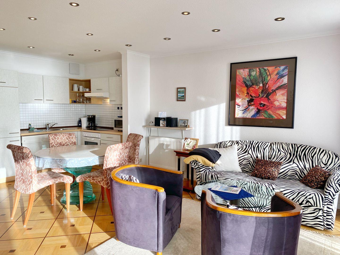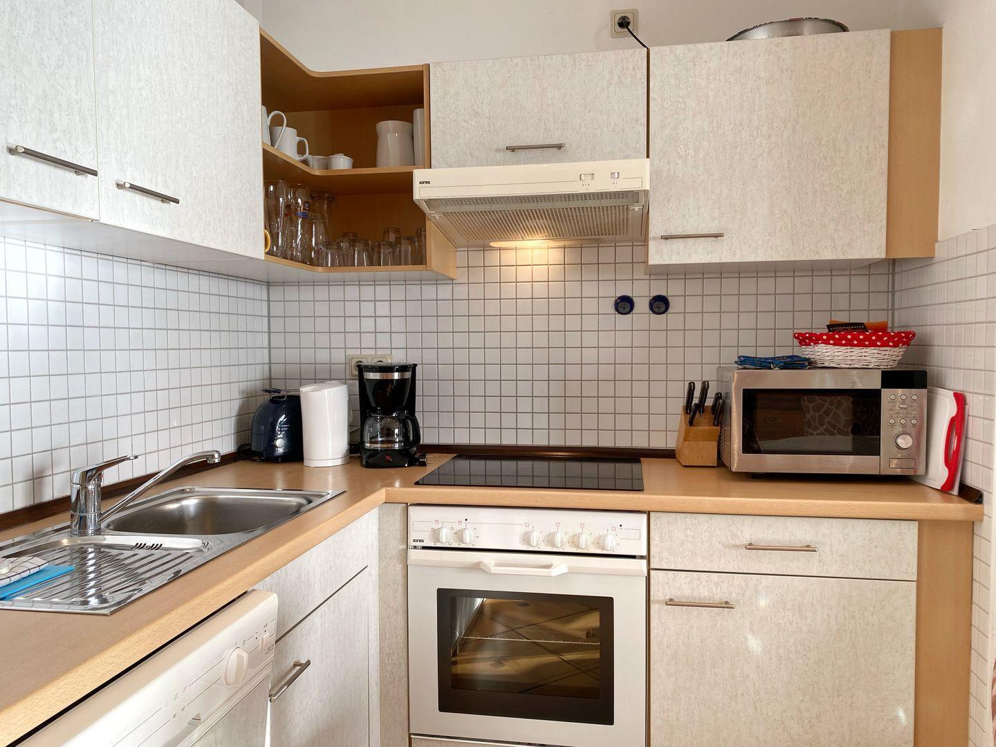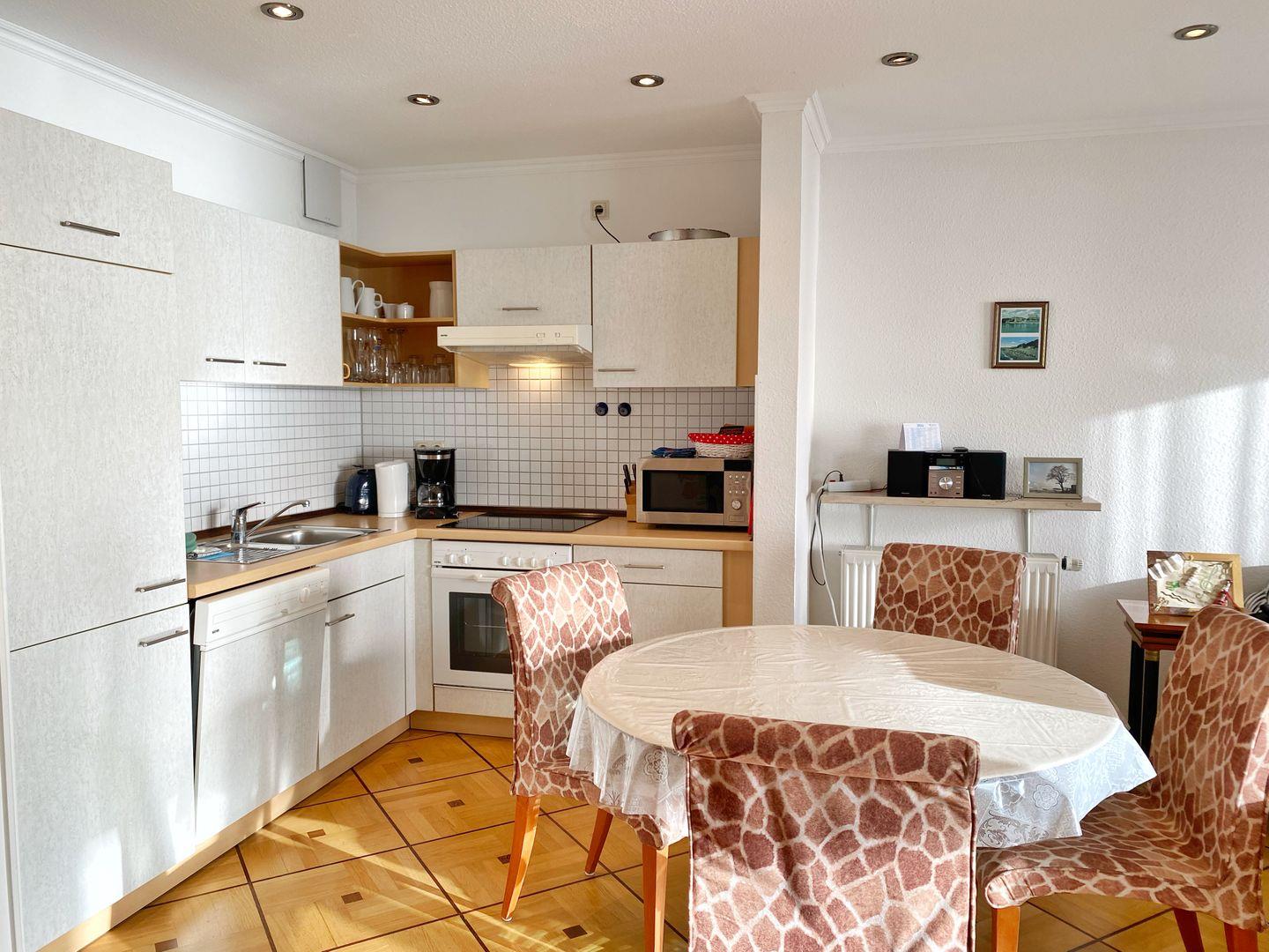 Die Wohnung besteht aus einem großen und hellen Wohnbereich mit vorgelagerter, überdachter Südterrasse. Das Wohnzimmer verfügt über einen integrierten Koch- und Essbereich mit einer komplett ausgestatteten, modernen Küchenzeile (Ceranherd, Backofen, Mikrowelle, Geschirrspüler, Wasserkocher etc.). Auf einer ausziehbaren Schlafcouch können 2 Personen sehr bequem übernachten. Außerdem finden Sie hier einen Flachbildfernseher und Radio.