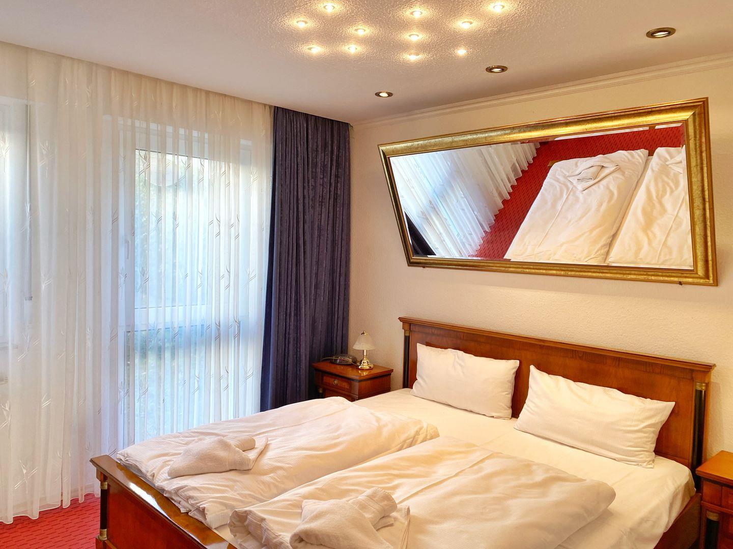 Das Schlafzimmer ist mit einem Doppelbett, Kleiderschrank und Nachttischen ausgestattet. Das Badezimmer bietet eine Dusche.