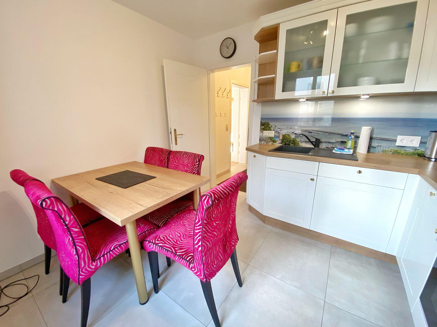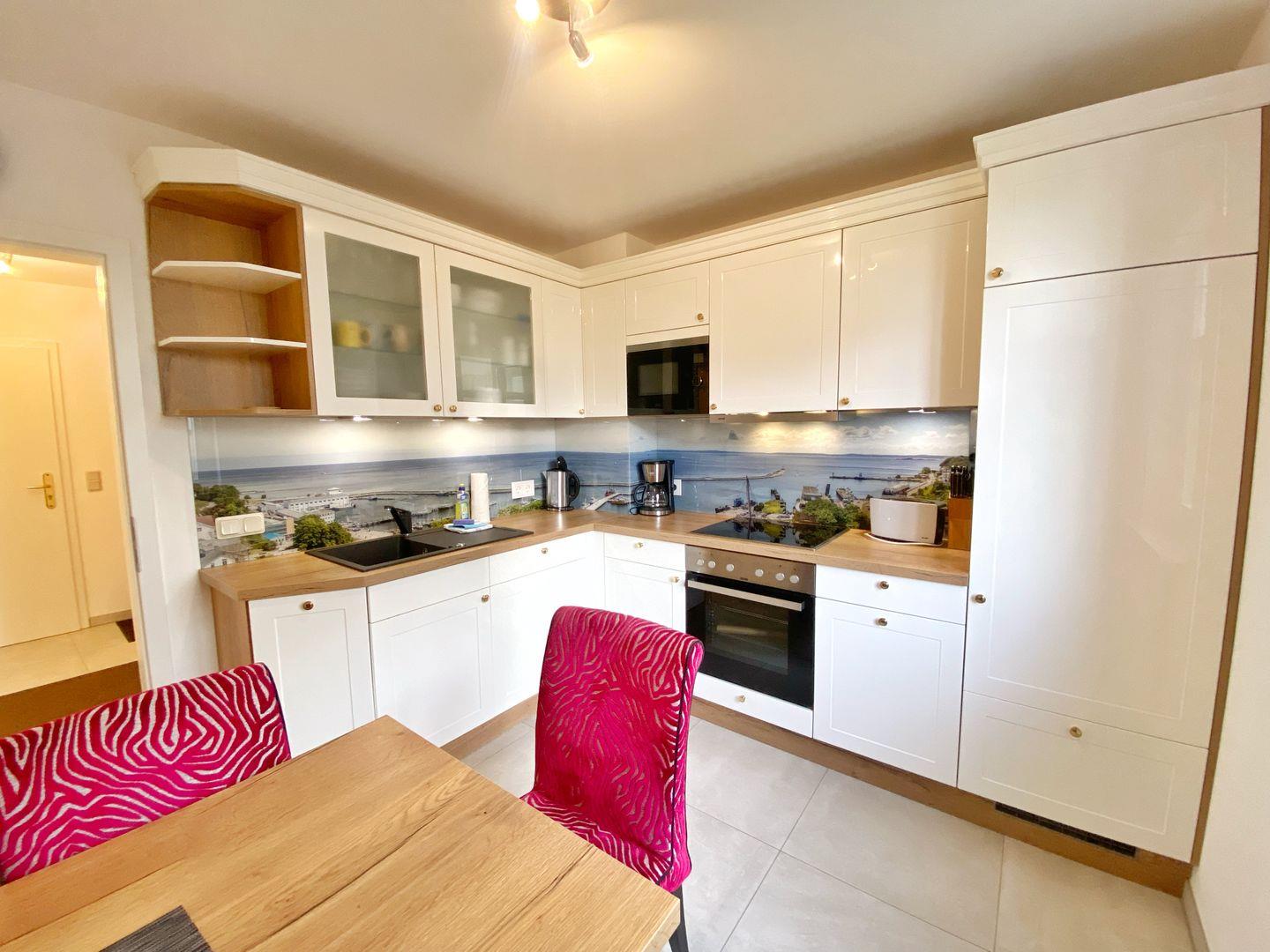 Im Erdgeschoß befindet sich das geräumige Wohnzimmer mit Esstisch und vorgelagertem Balkon. Die Küche ist geschlossen zum Wohnbereich und verfügt ebenfalls über einen Esstisch. Sie ist modern und komplett ausgestattet mit Geschirrspüler. Mikrowelle, Backofen, Ceranherd und natürlich mit Selbstverständlichkeiten wie Kaffeemaschine, Wasserkocher und Toaster. Außerdem gibt es ein Gäste-WC im unteren Bereich.