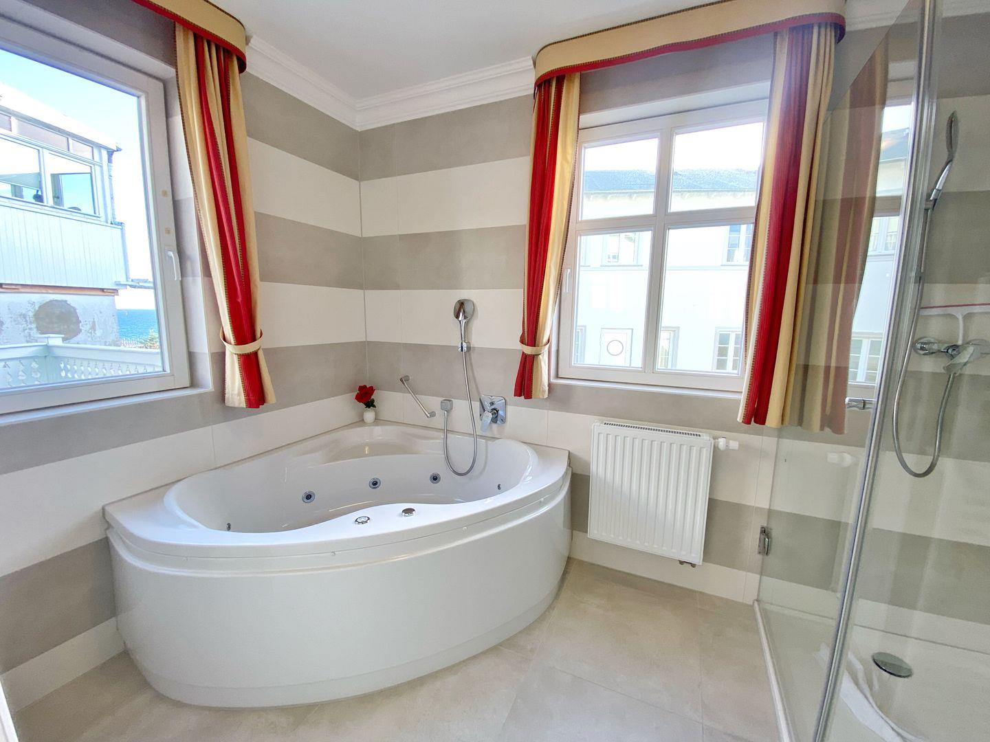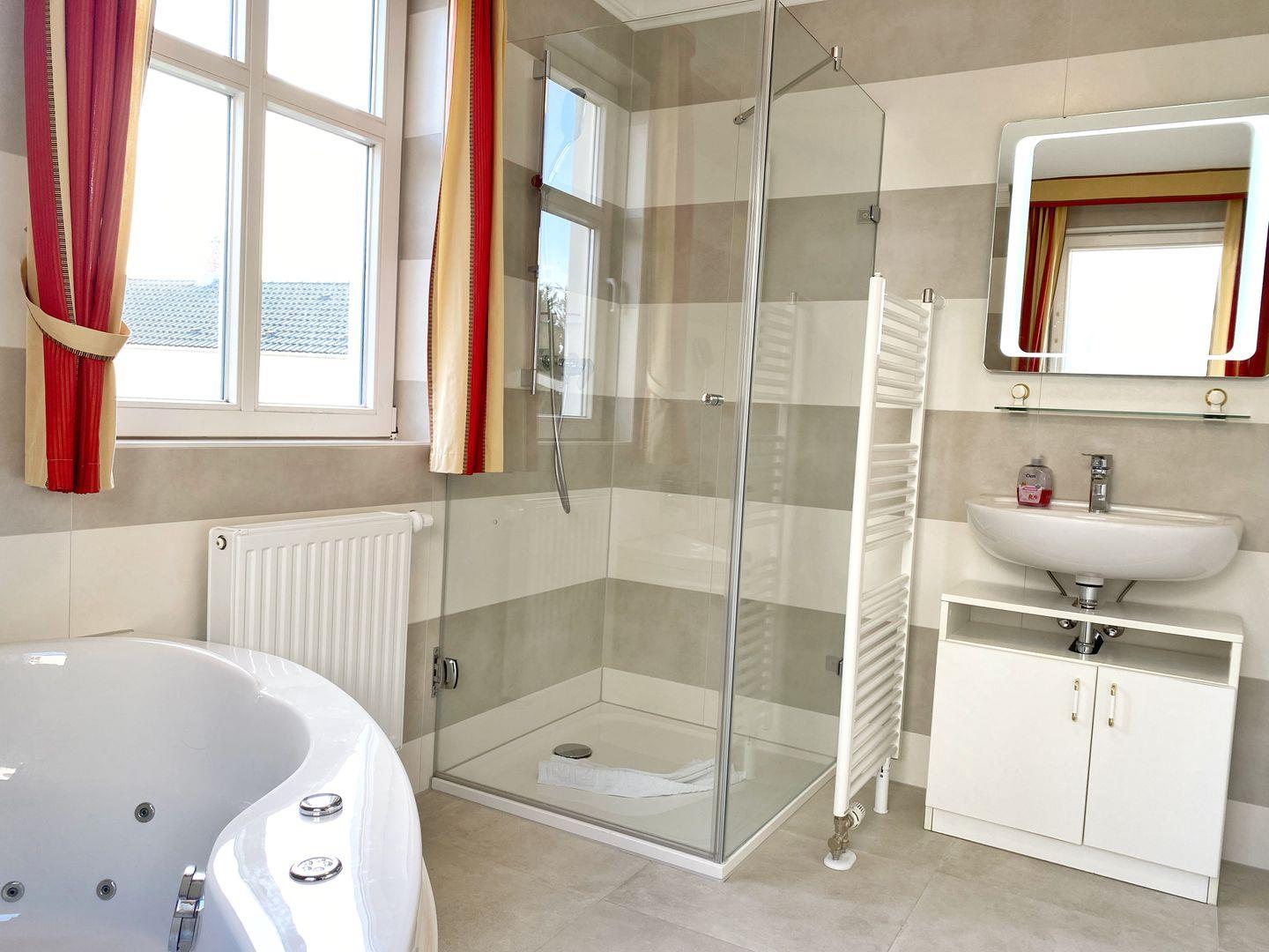 Im 1. OG befinden sich die beiden Schlafzimmer mit ebenfalls vorgelagertem Balkon und schönem Ostseeblick. Die Schlafzimmer bieten beide jeweils ein Doppelbett und eines davon auch einen Flachbild-TV. Das großzügige und helle Bad mit gleich zwei Fenstern und Blick auf die Ostsee verwöhnt die Gäste mit einer großen Eckbadewanne inkl. Whirlpool und einer separaten Dusche.
