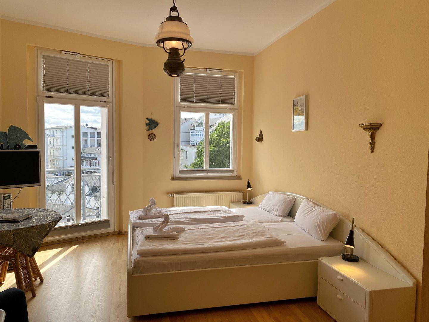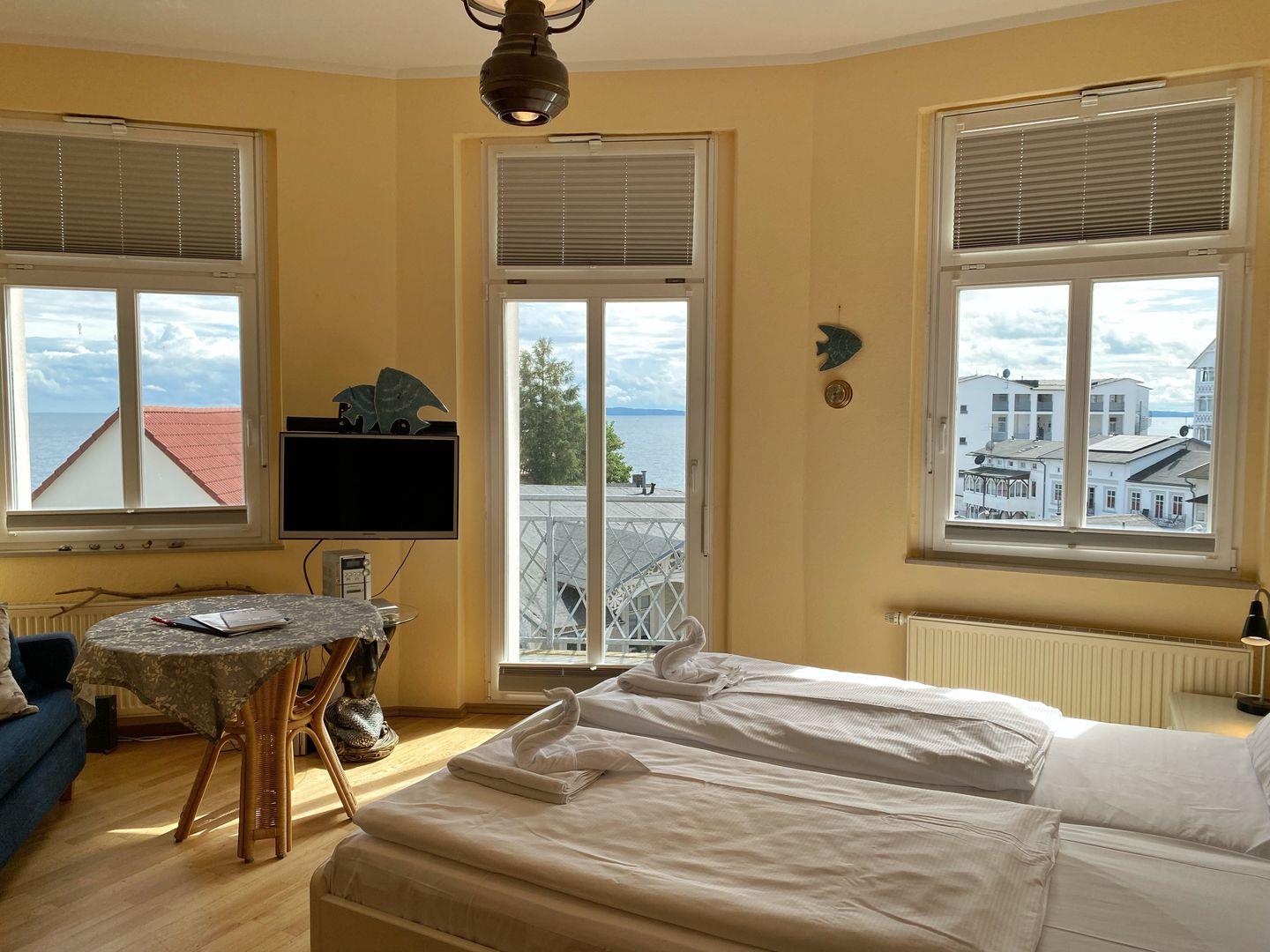 Das Appartement bietet ein Wohn-Schlafzimmer und eine separate Küche mit Esstisch, beide mit vorgelagertem Balkon und Ostseeblick.