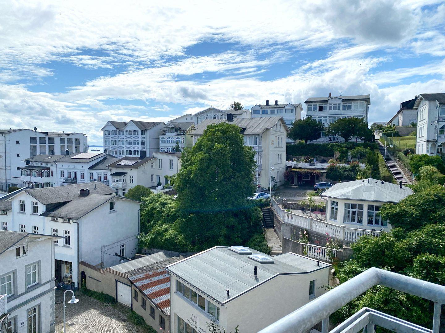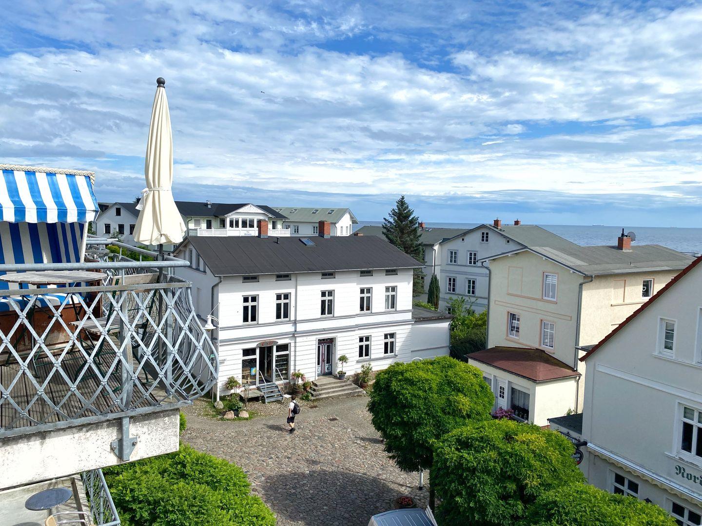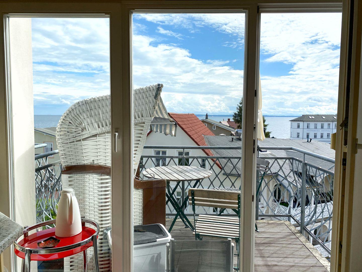 • Balkon mit Strandkorb und Blick auf Alt-Sassnitz und die Ostsee