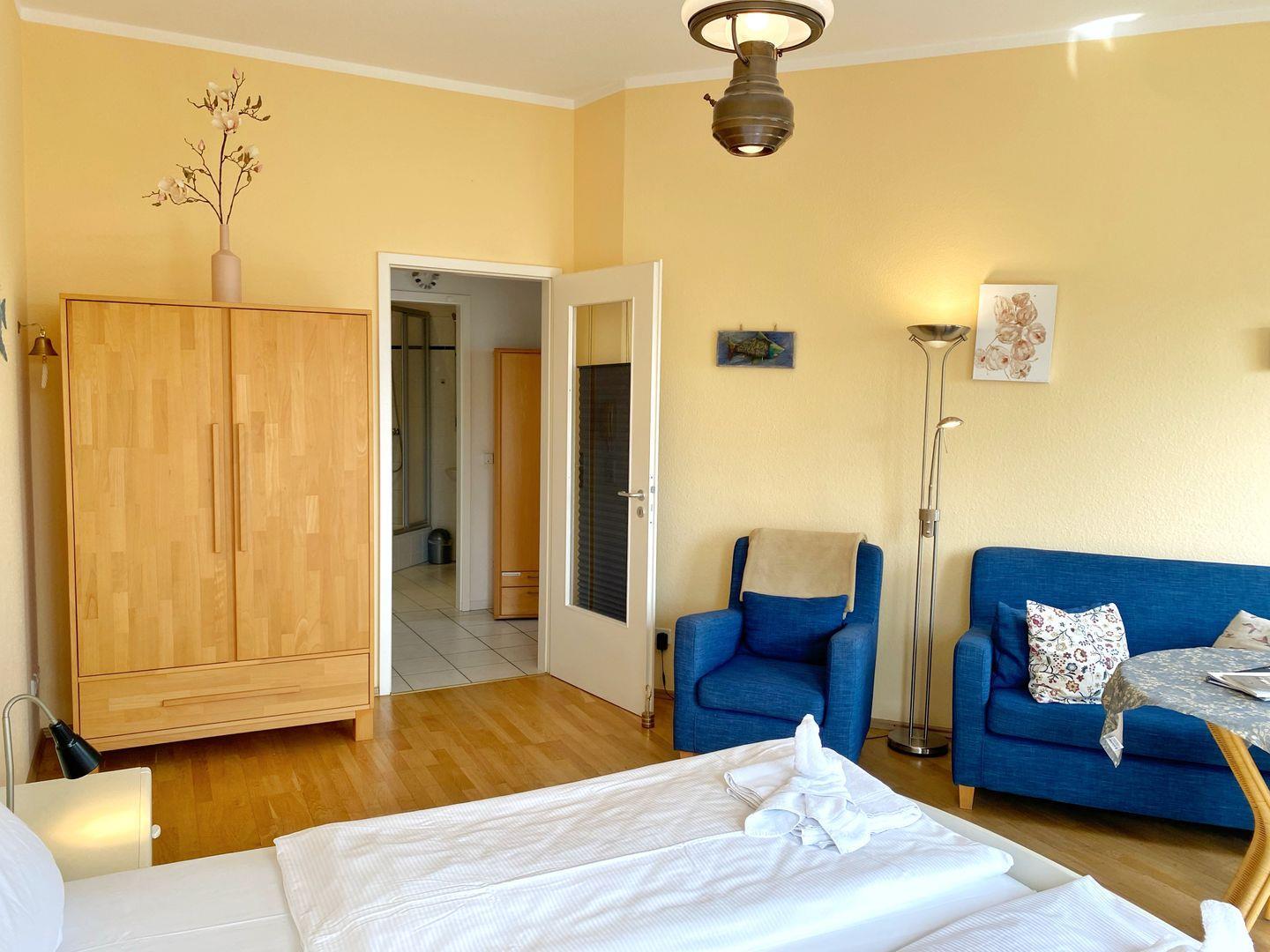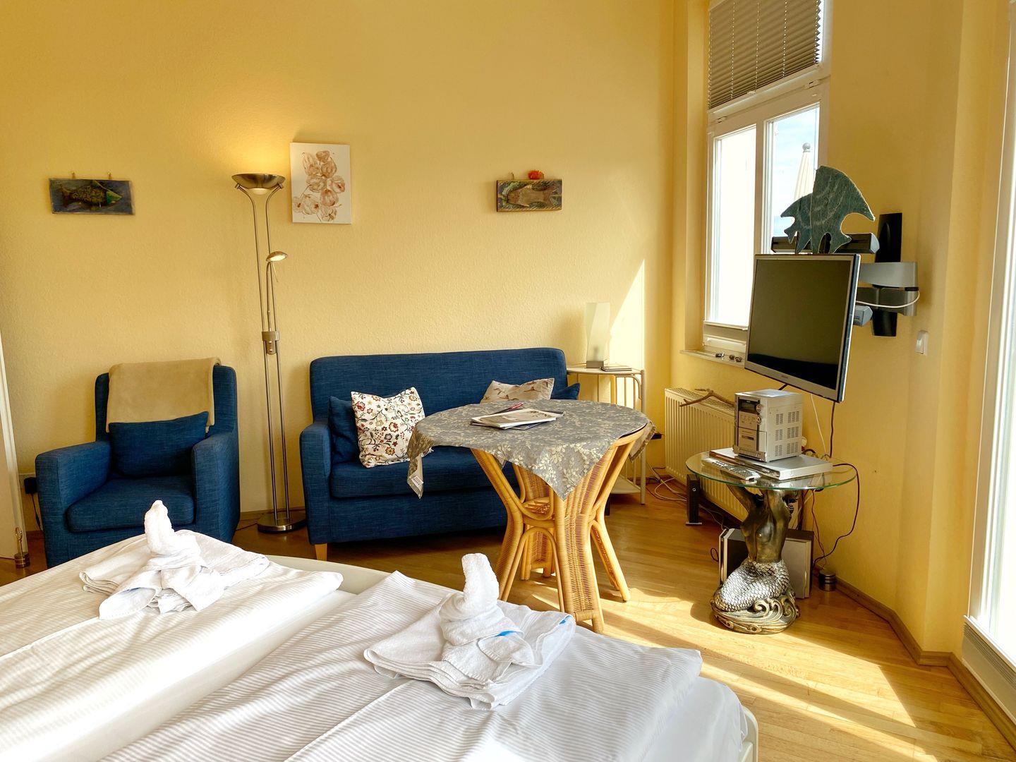 • Wohn-/ Schlafbereich mit Tisch, Sofa, Sessel und Doppelbett, Flachbild-TV und Radio
