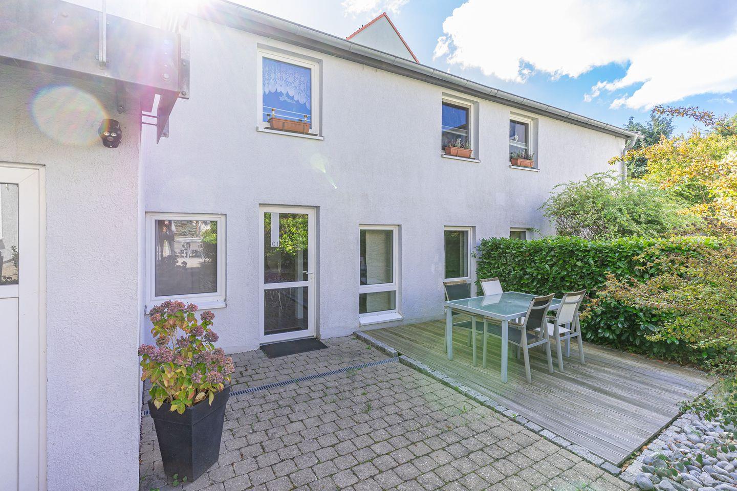 Neben zwei modern möblierten Räumen lädt eine Holzterrasse mit Gartenmöbeln zum verweilen ein.