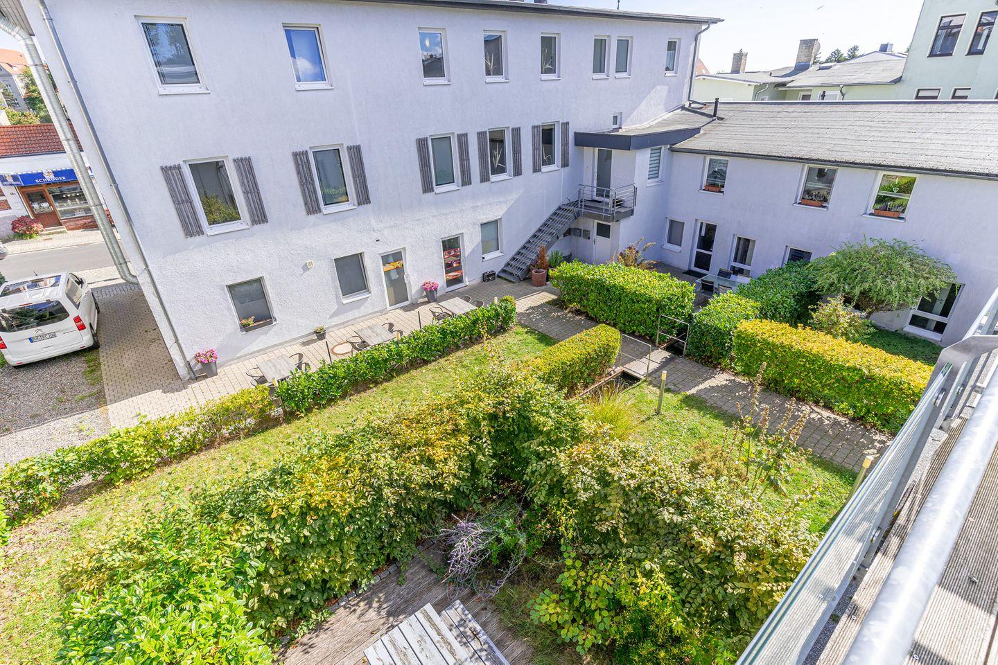 Das zeitlose Appartement im 1. Obergeschoss des Haupthauses bietet auf 35qm Wohnfläche Platz für 2 Personen.