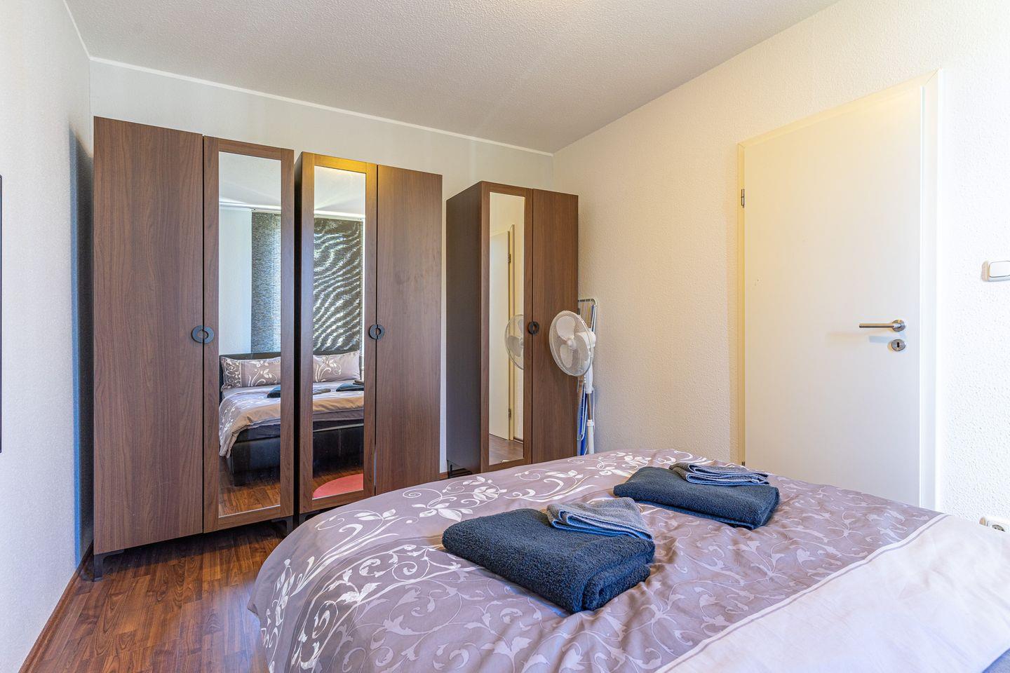 Im Schlafzimmer gibt es ein Doppelbett (140/200 cm) sowie drei Kleiderschränke mit Ganzkörperspiegeln.