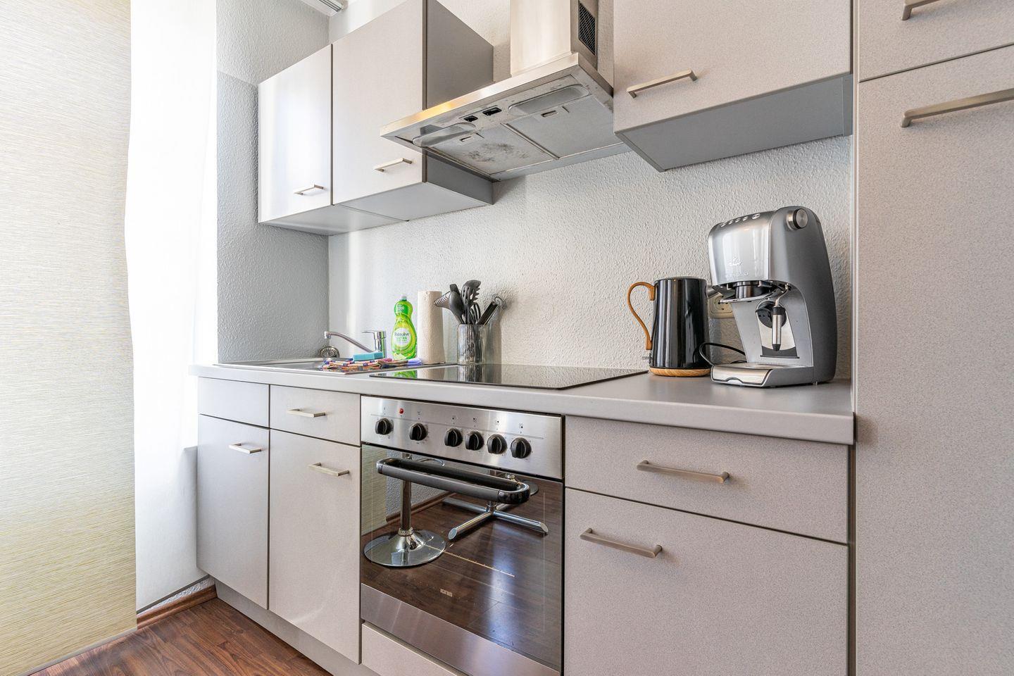 Die helle und moderne Einbauküche bietet neben Cerankochfeld, Backofen und Kühlschrank mit Gefriermöglichkeit eine Kaffeemaschine, Toaster und Wasserkocher.