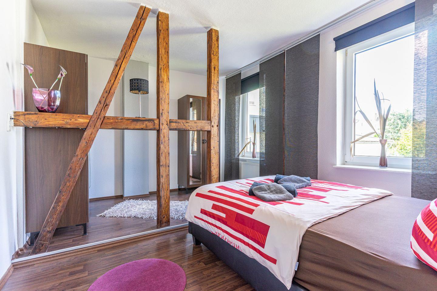 Das zeitlose Appartement im 1. Obergeschoss des Haupthauses bietet auf 49qm Wohnfläche Platz für 2 Personen.
