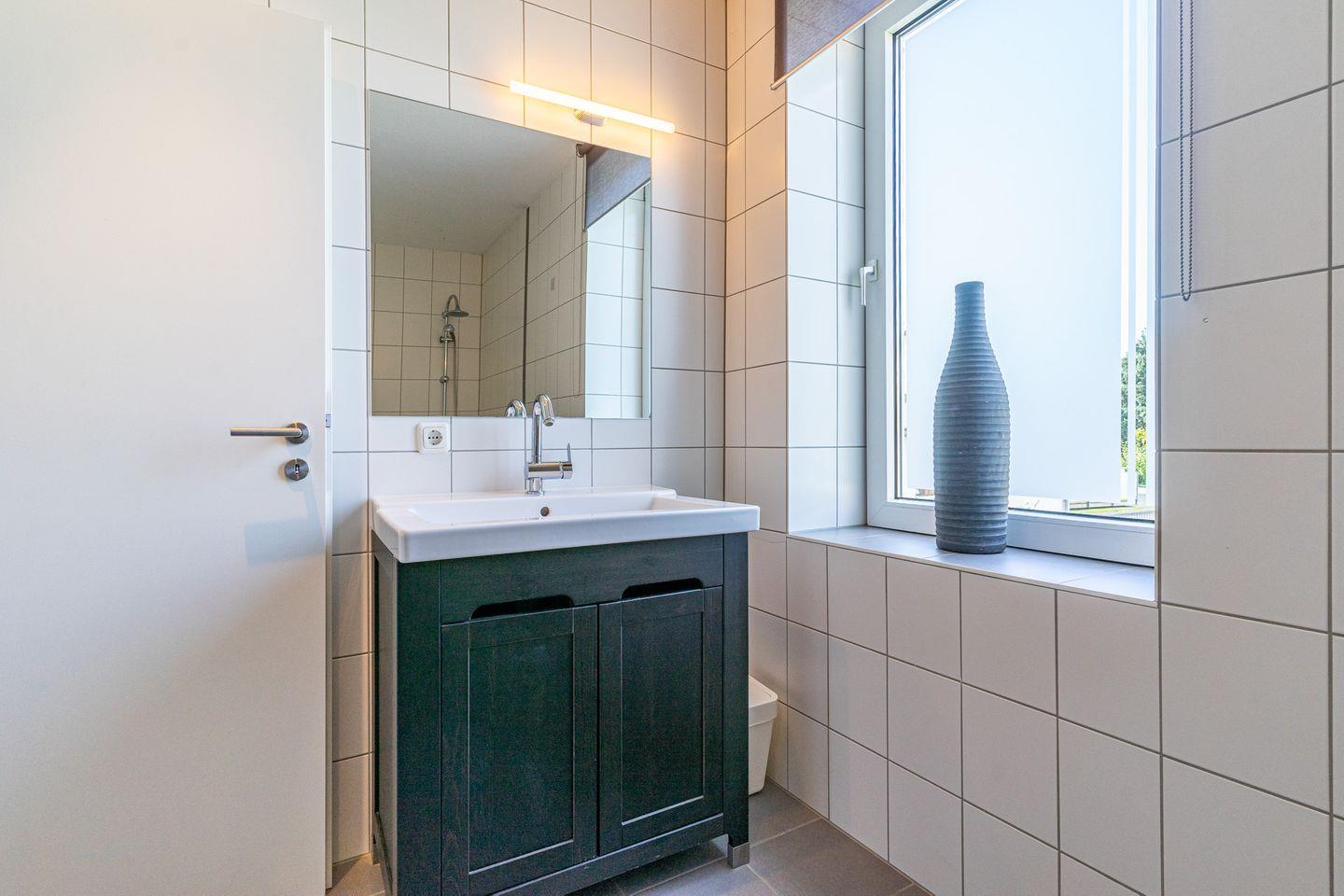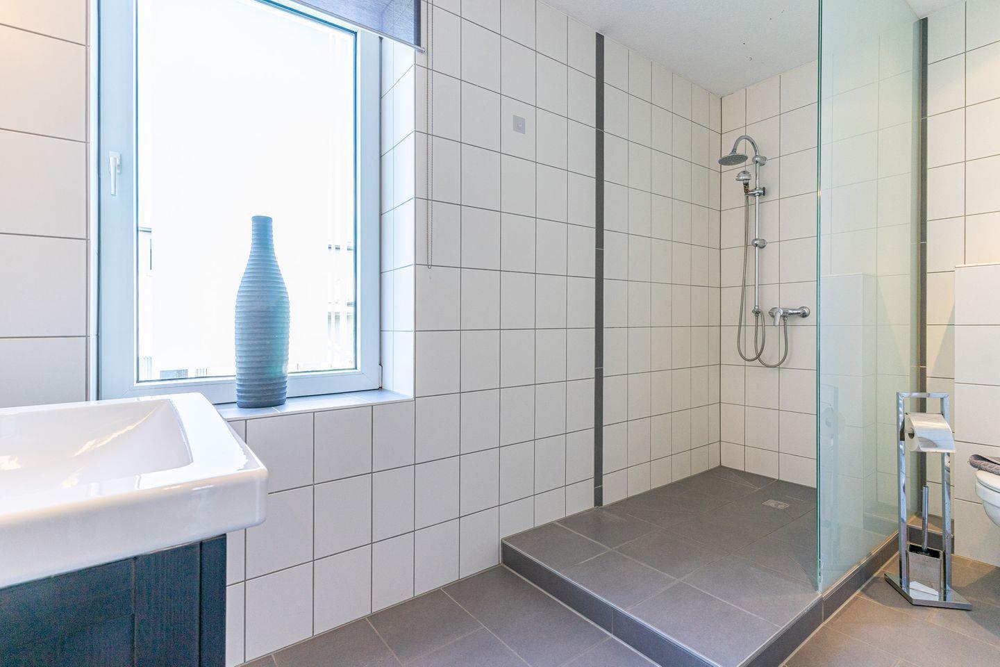 Das Badezimmer mit Tageslicht verfügt über eine ebenerdige, offene Dusche sowie über ein WC und Waschtisch.