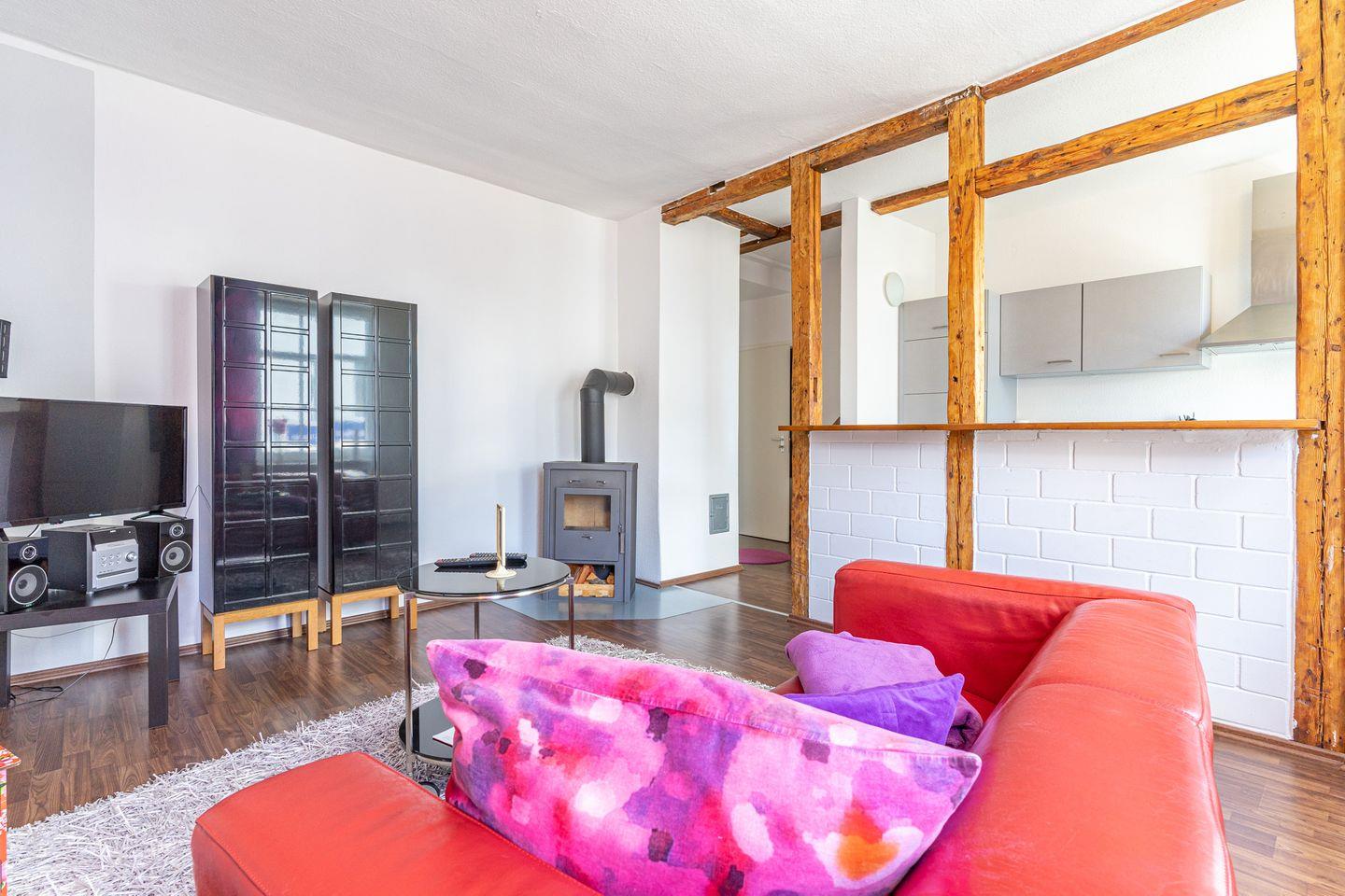 In das Wohnzimmer mit Sofa sowie TV- & Radiogeräten ist eine offene Küche mit Tresen und Barhockern integriert.
