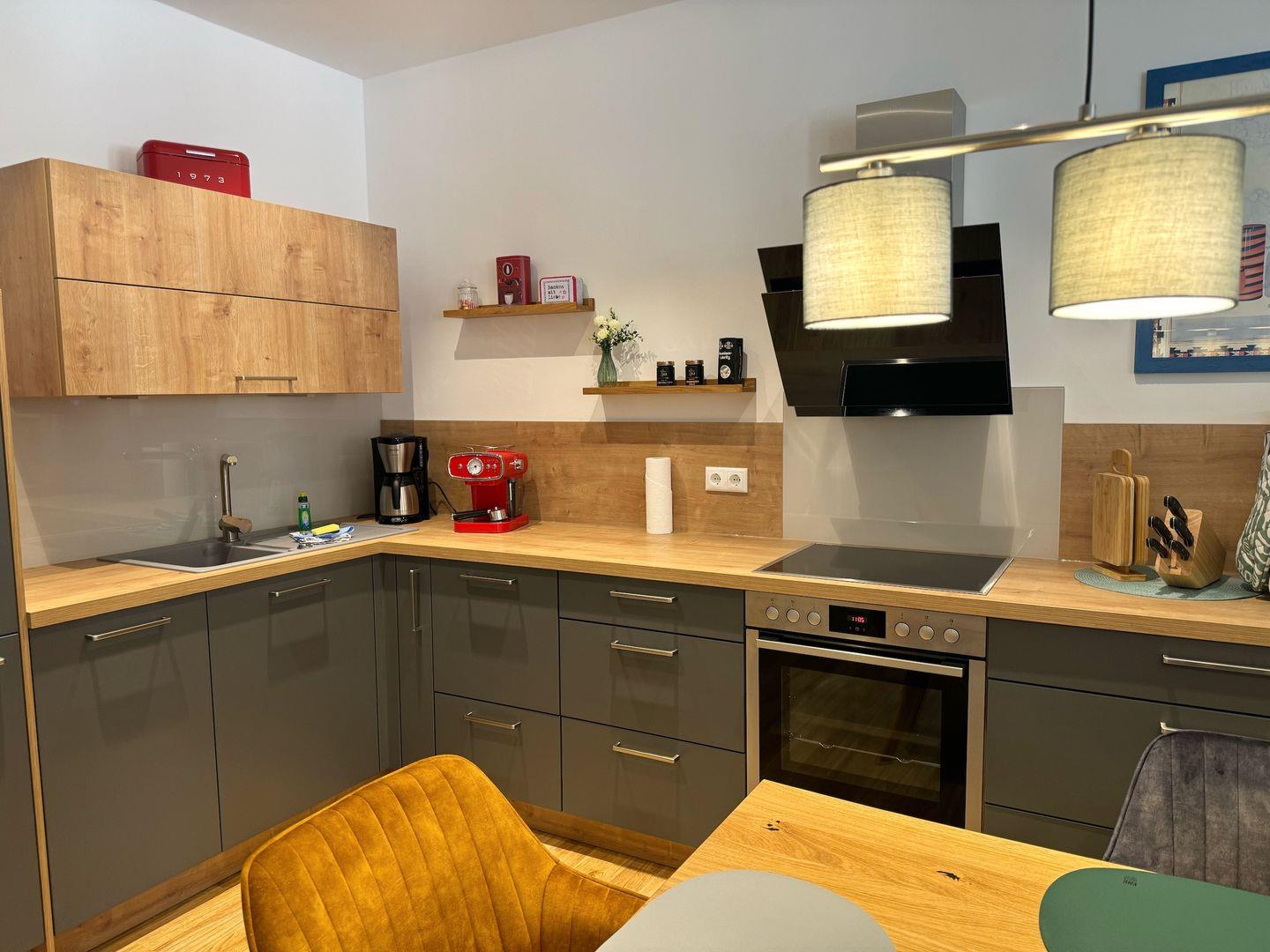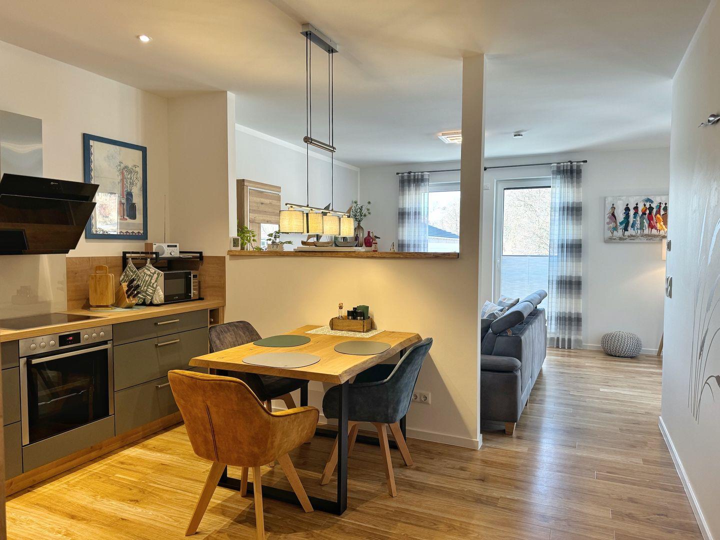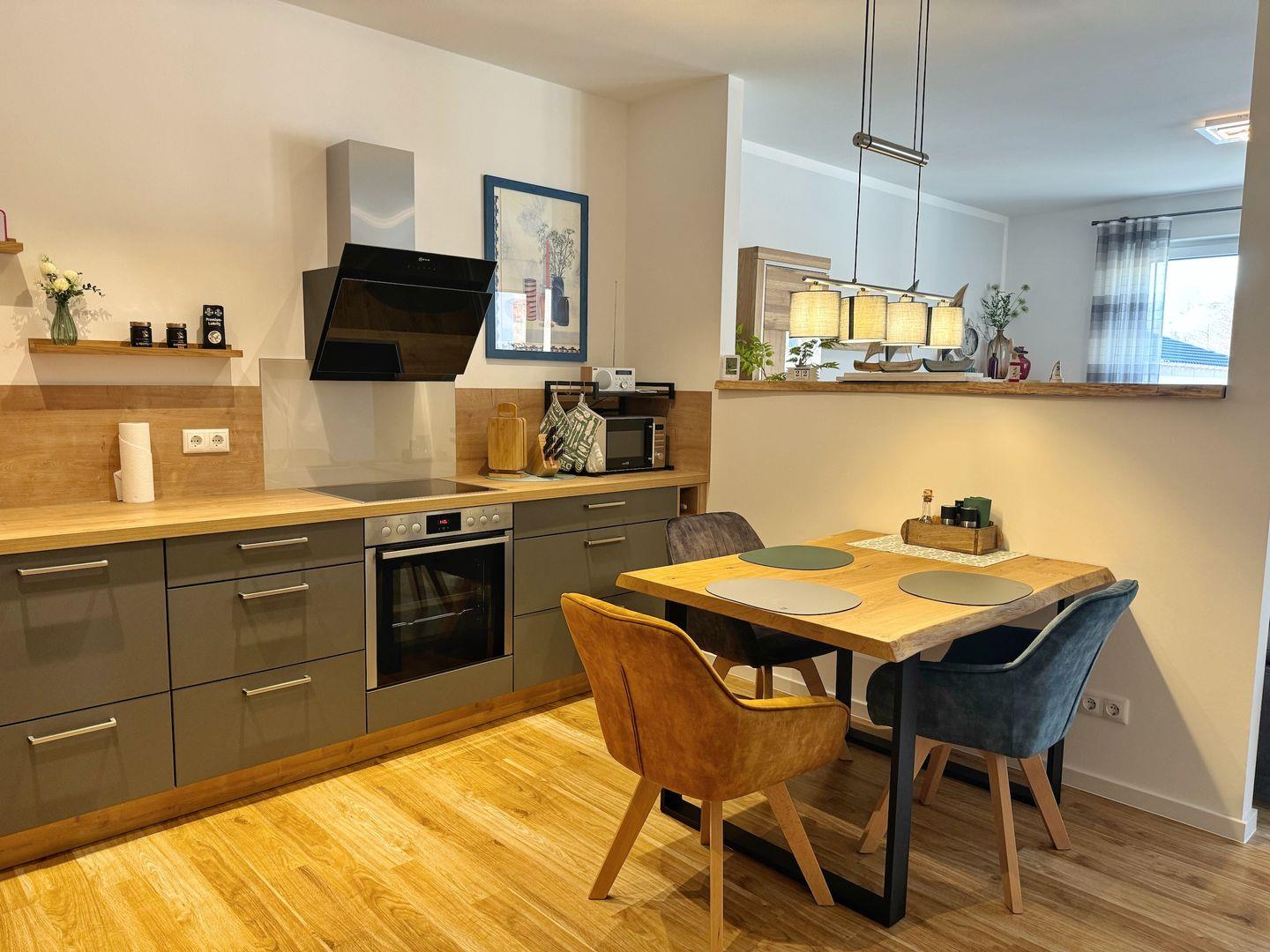 In das Wohn-Esszimmer ist eine moderne Einbauküche integriert. Die Küche ist komplett ausgestattet mit Geschirrspüler, Induktions-Herd, Backofen, Mikrowelle, Kühlschrank mit Gefriermöglichkeit und weiteren Selbstverständlichkeiten wie Kaffeemaschine, Wasserkocher und Toaster.