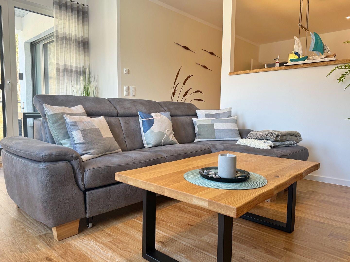 Im Wohnbereich gibt es neben einem bequemen Sofa, Flachbild-TV und Radio einen Essplatz.