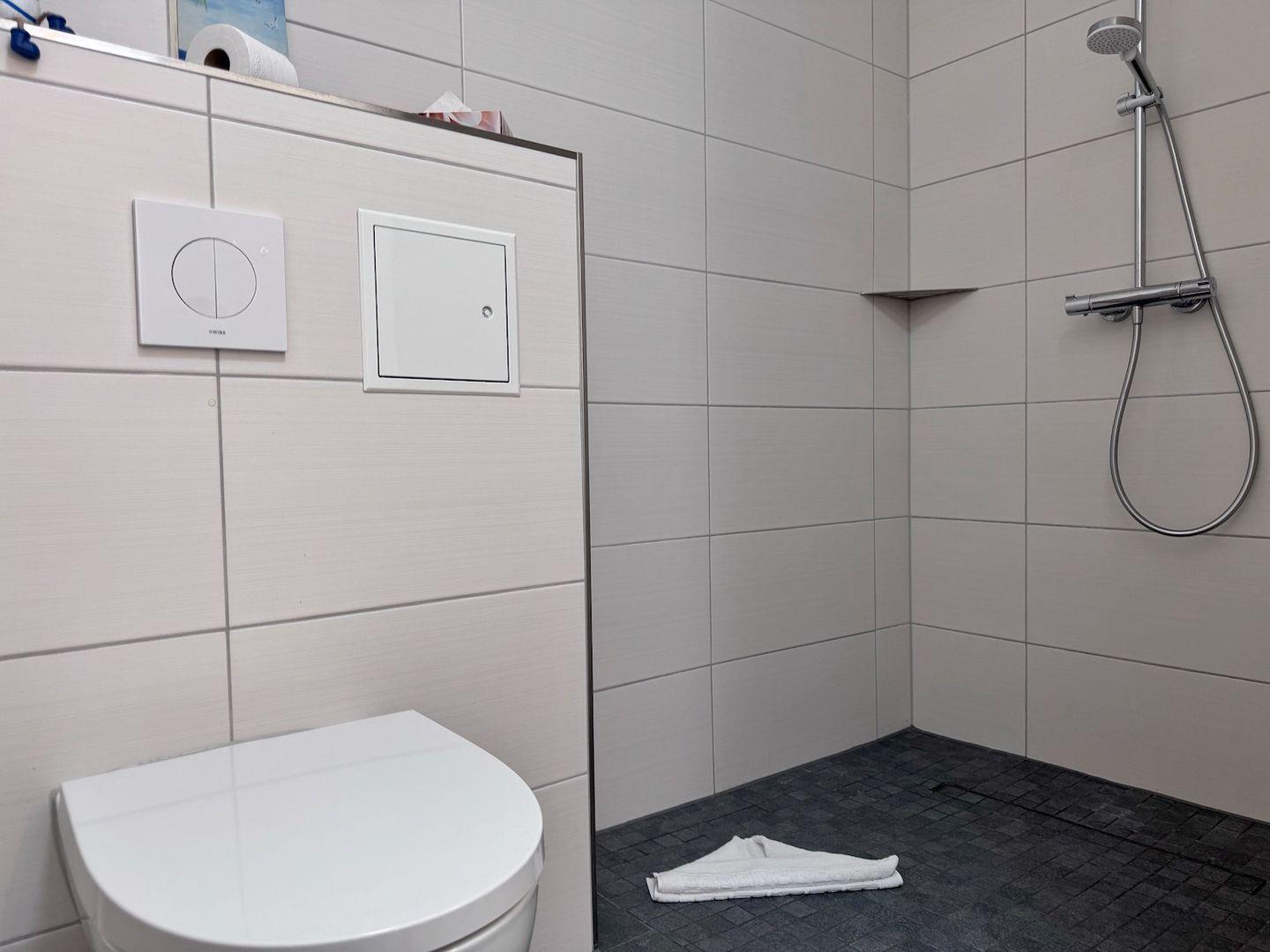 Das Badezimmer ist mit Dusche und WC ausgestattet und bietet warmes Wasser, Waschbecken, Spiegel sowie einen Haartrockner. Für längere Aufenthalte oder aktiven Urlaub sind Waschmaschine und Trockner besonders praktisch; die Trocknernutzung ist gemeinschaftlich. Ein Wäscheständer steht ebenfalls bereit. Die Wohnung ist beheizt und rollstuhlfreundlich. Auf dem Balkon können Sie mit vorhandenen Gartenmöbeln entspannen.