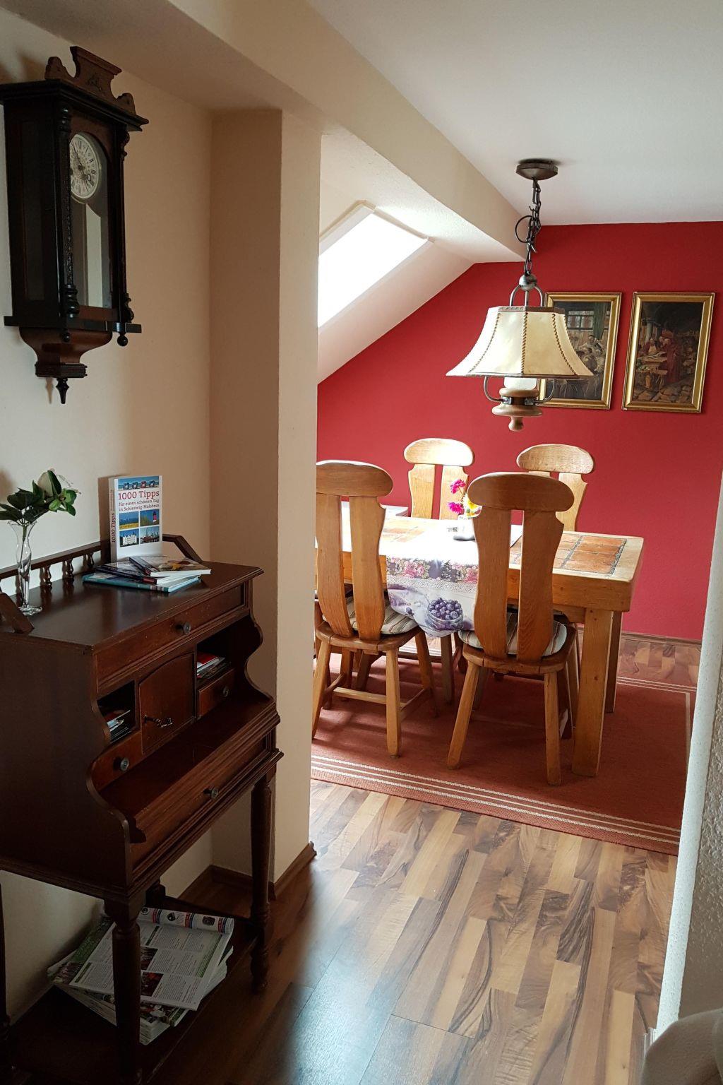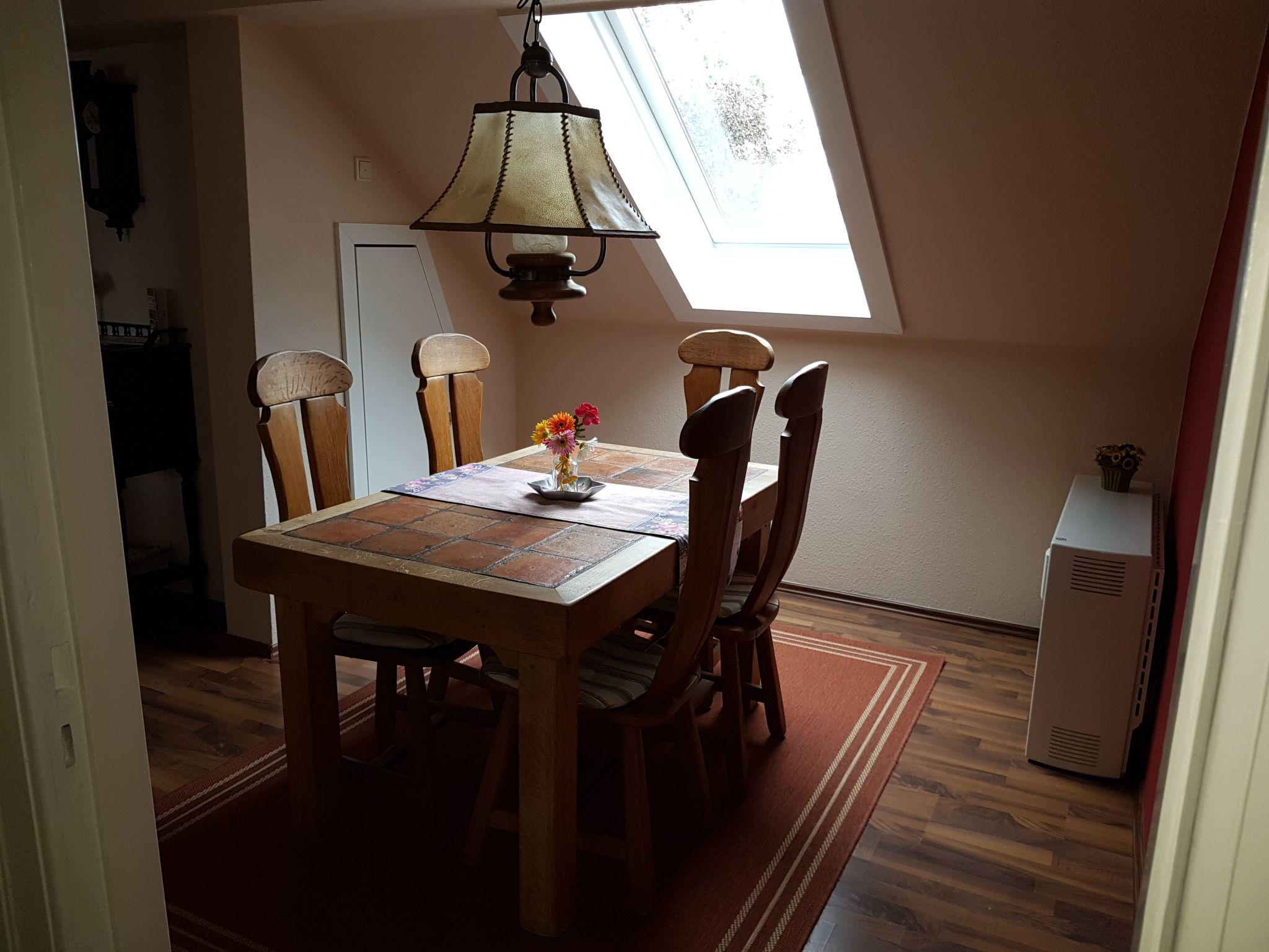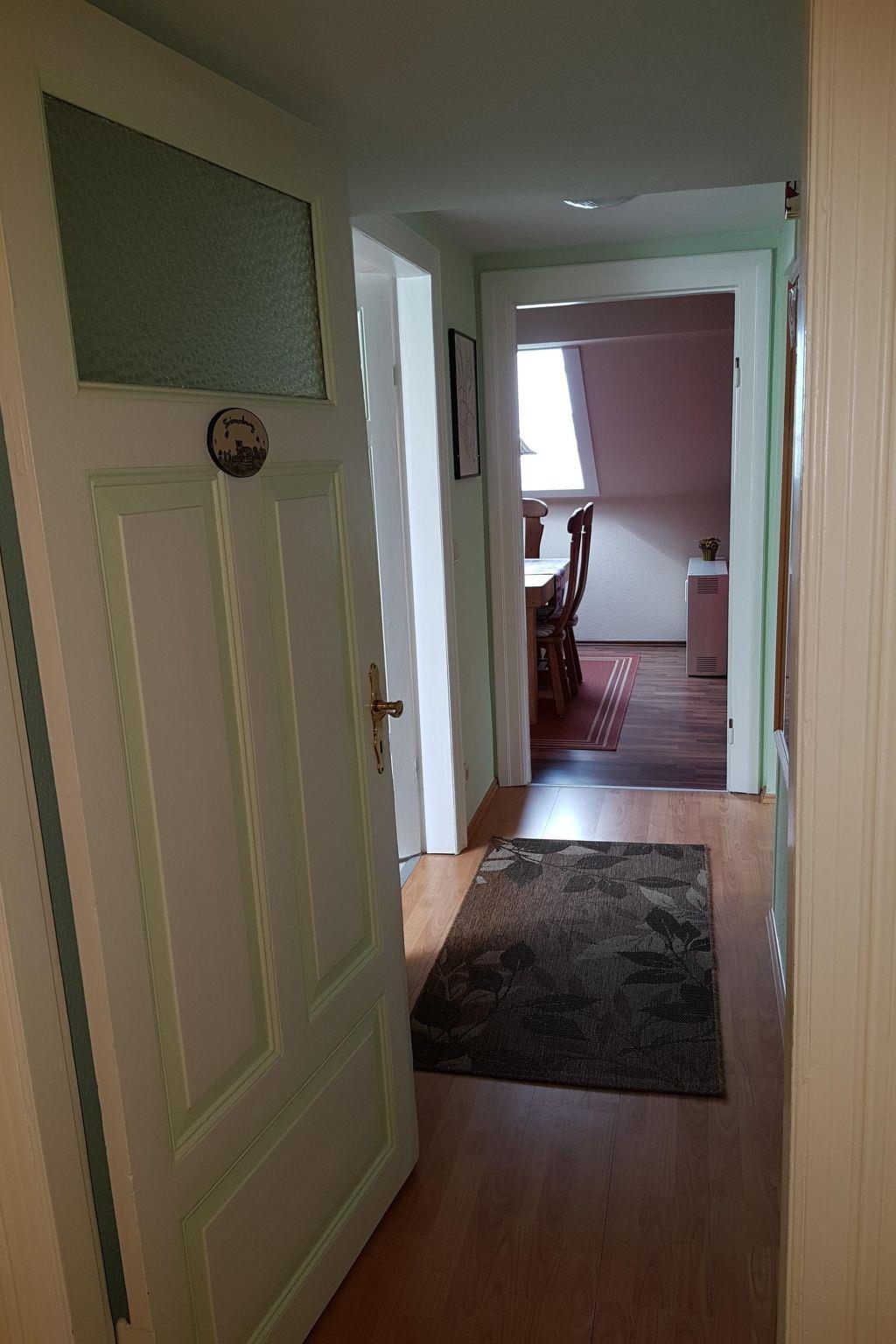 Die schöne und gemütliche Nichtraucher- Ferienwohnung befindet sich in der ersten Etage eines Zweifamilienhauses und ist über einen separaten Eingang / Treppe erreichbar. Es erwartet Sie ein helles Wohn- und Esszimmer mit TV, DVD und Radio-CD-Player, ein Schlafzimmer mit Doppelbett, ein Balkonzimmer mit zwei weiteren Schlafplätzen, ein Frühstücks-Balkon mit Gartenmöbeln, Schirm und Auflagen, ein komfortables Duschbadezimmer, eine schicke Küche mit Herd, Backofen, Mikrowelle und Geschirrspüler, sowie ein zusätzliches WC mit einer Wasch-Trocknerkombination. Insektenschutz befindet sich an Fenstern und Balkontür. Bettwäsche, Handtücher und Geschirrtücher sind vorhanden. Auf Anfrage sind Haustiere erlaubt.