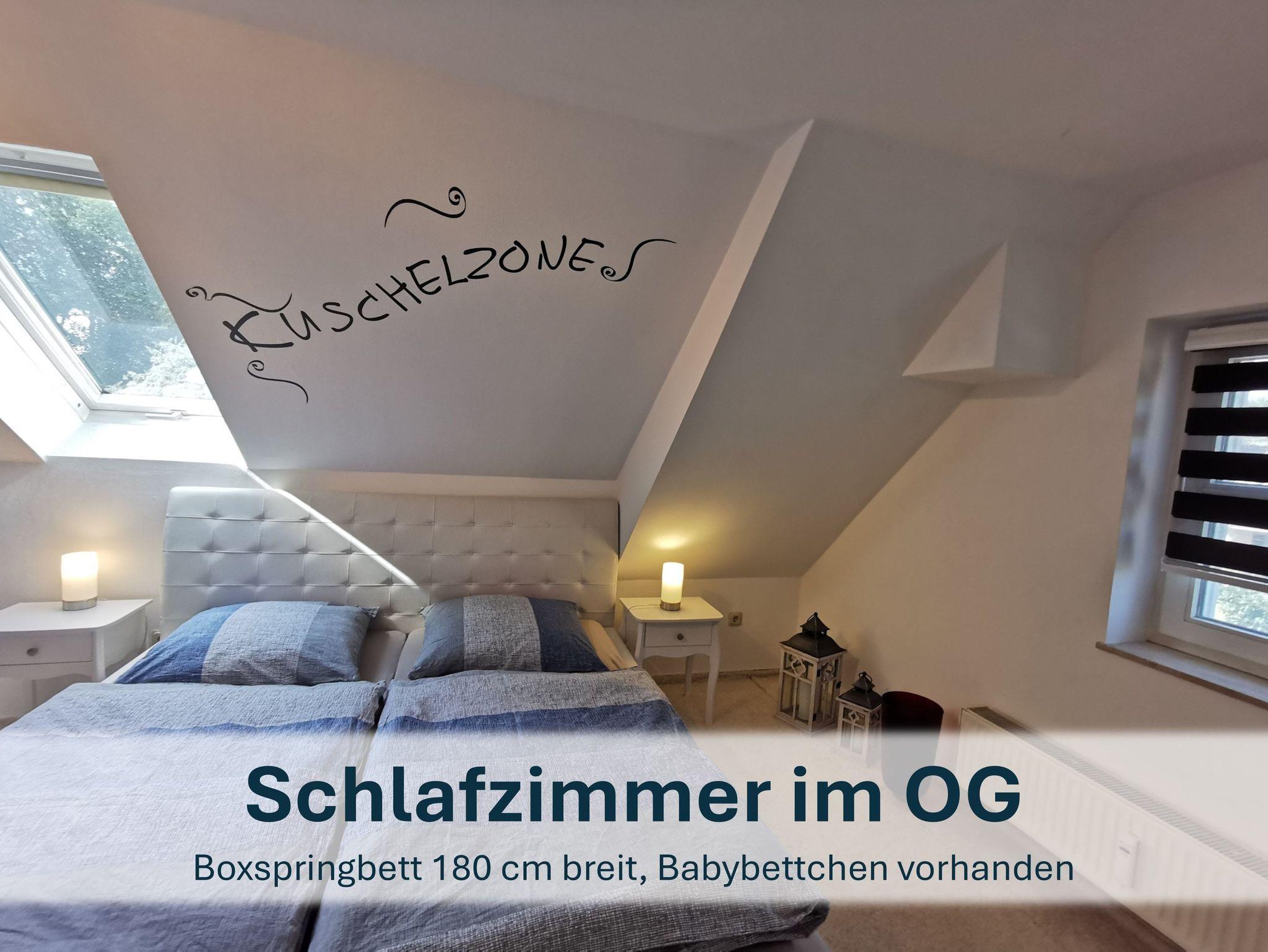 Über eine Holztreppe gelangen Sie in das zweite Obergeschoss, wo sich ein behaglich eingerichtetes Schlafzimmer mit breitem Boxspringbett und ausreichend Stauraum befindet.