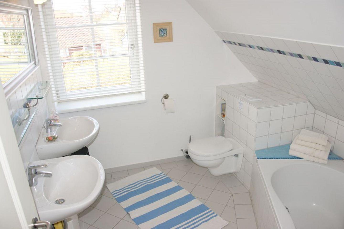 Das Ferienhaus verfügt über zwei Bäder. Das Bad im Obergeschoss bietet eine Badewanne, zwei Waschbecken und ein WC. Das Bad im Erdgeschoss verfügt über eine ebenerdige Dusche, ein WC und ein Waschbecken. Für zusätzlichen Komfort steht Ihnen eine Waschmaschine zur Verfügung.