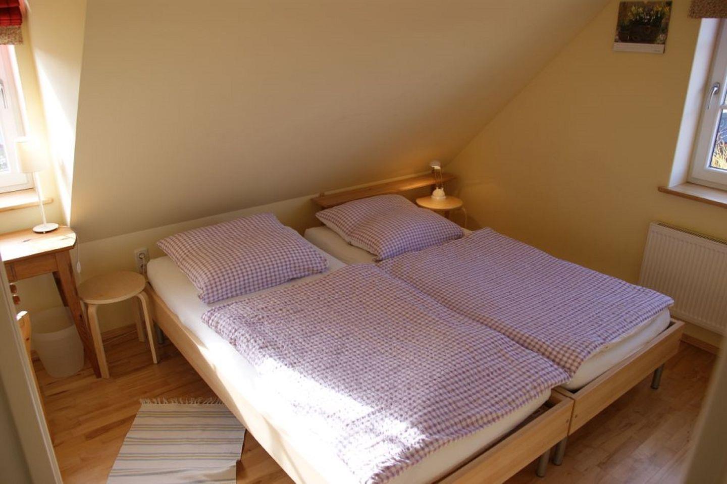 Das Ferienhaus bietet drei Schlafzimmer, die sich alle im Obergeschoss befinden. Im ersten Schlafzimmer erwartet Sie ein komfortables Doppelbett mit zwei Matratzen (180 x 200 cm) sowie ein geräumiger Kleiderschrank. Das zweite Schlafzimmer ist mit zwei Einzelbetten (je 90 x 200 cm) und einer Kommode ausgestattet, während das dritte Schlafzimmer ein Einzelbett (90 x 200 cm) und eine weitere Kommode bietet. Alle Schlafzimmer sind mit Raffrollos ausgestattet, die eine angenehme Verdunkelung ermöglichen.