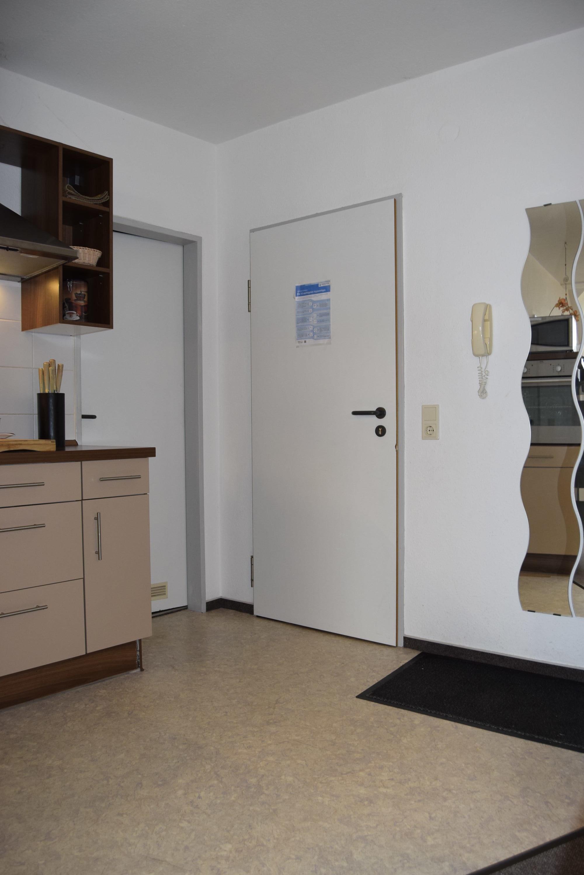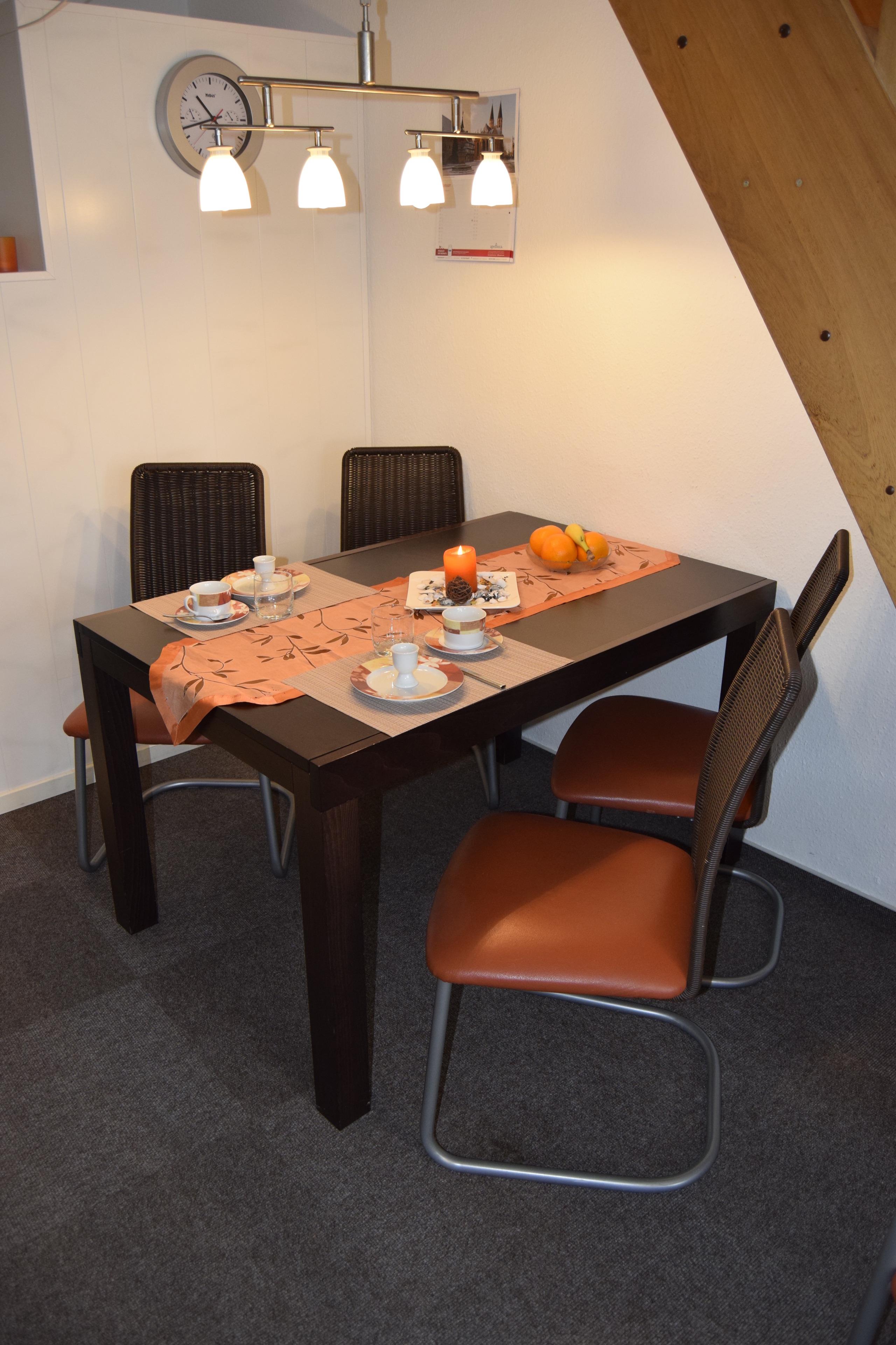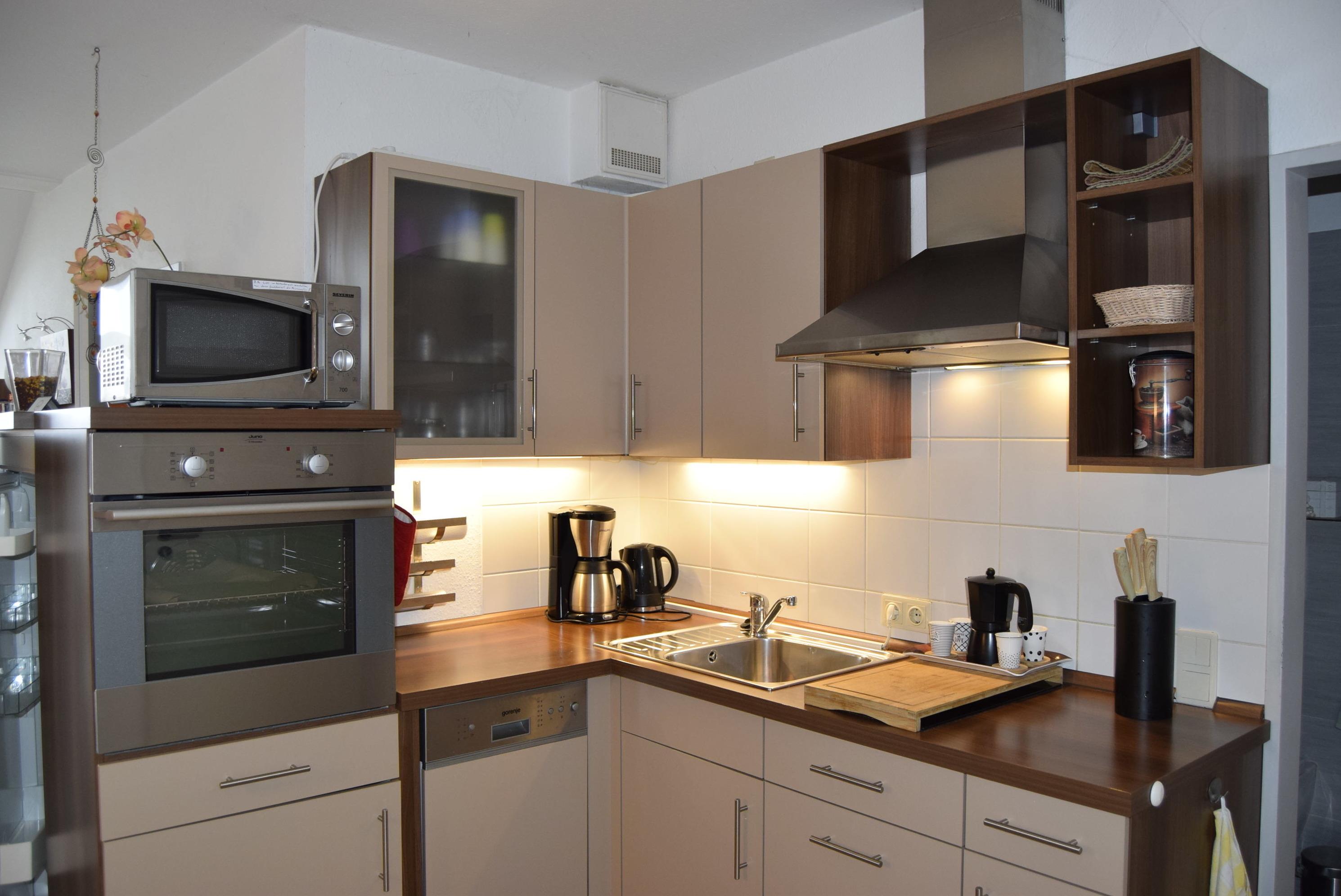 Die zum Wohnbereich offene, moderne und komplett eingerichtete Einbauküche ist mit Geschirrspüler, Kühl-Gefrierkombi, E-Herd mit 2-Platten-Cerankochfeld, Backofen und Dunstabzug ausgestattet. Der Essbereich schließt sich an.