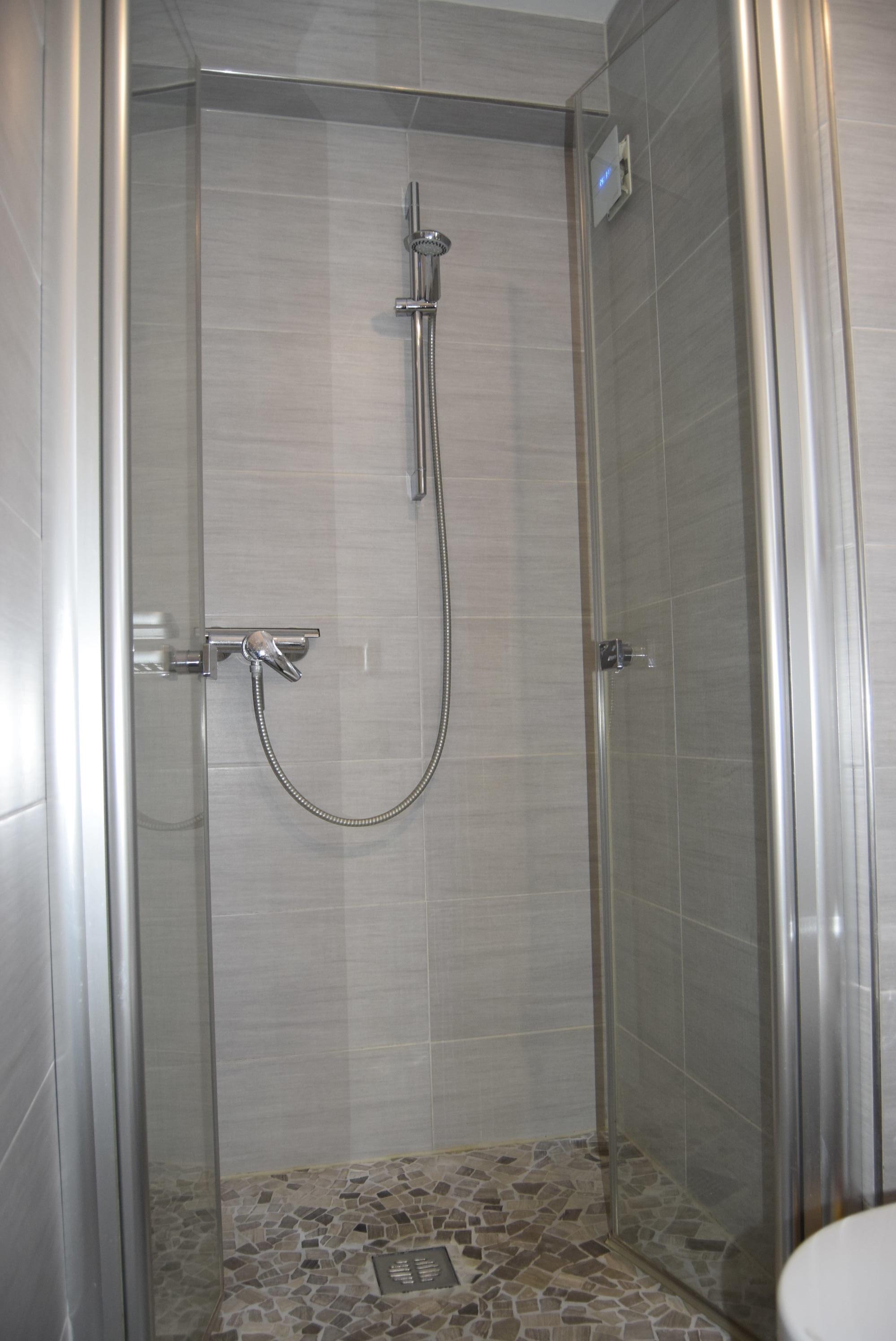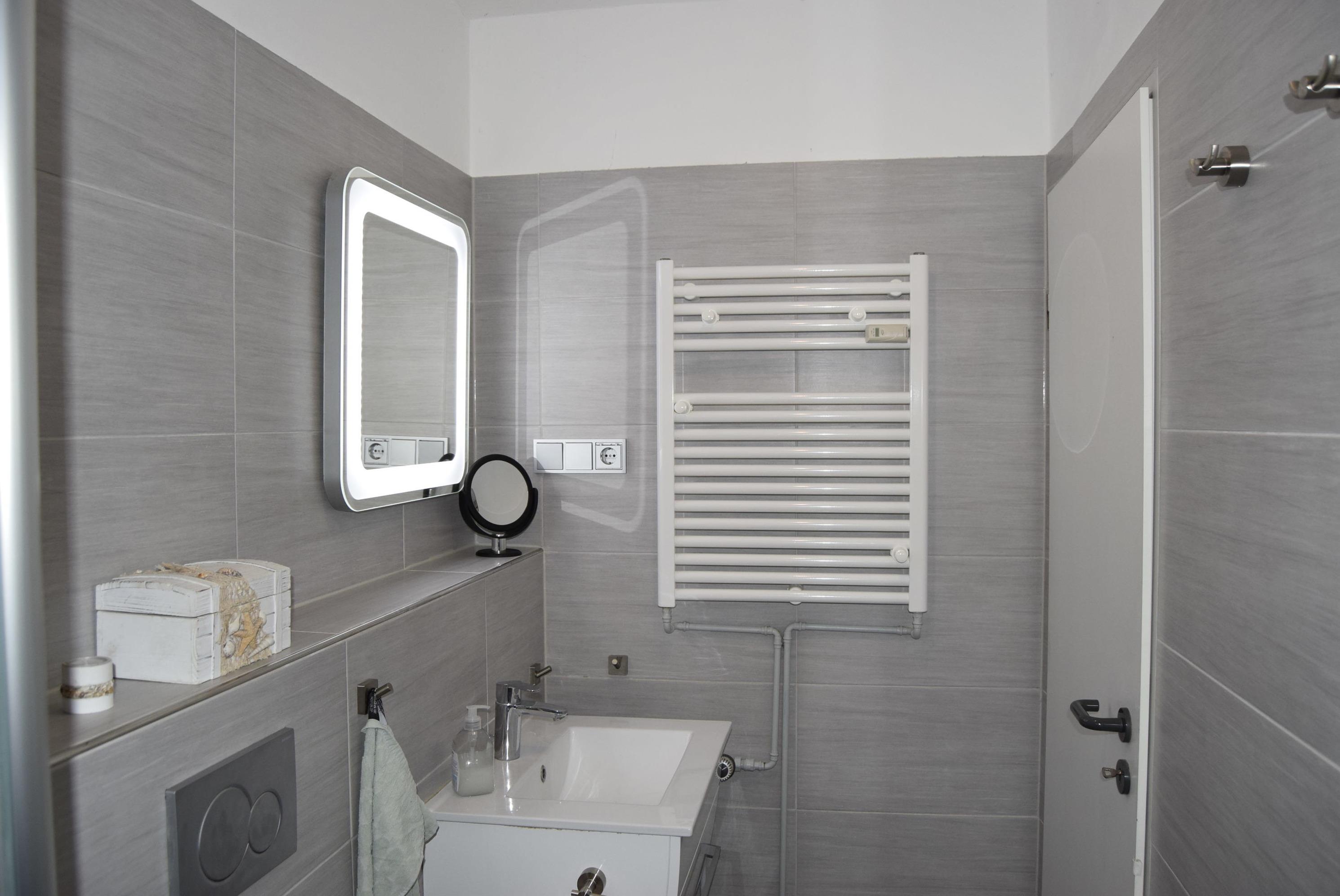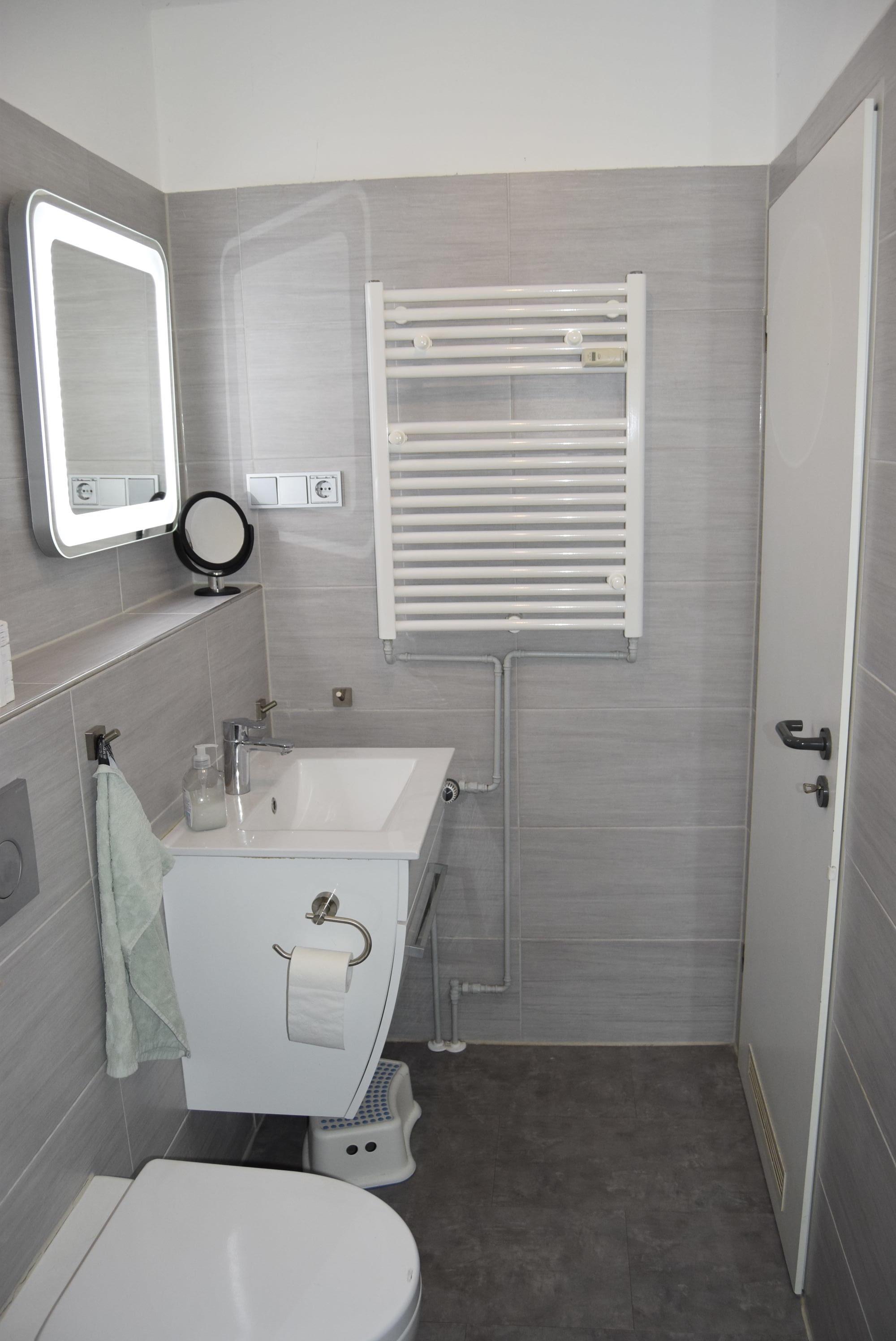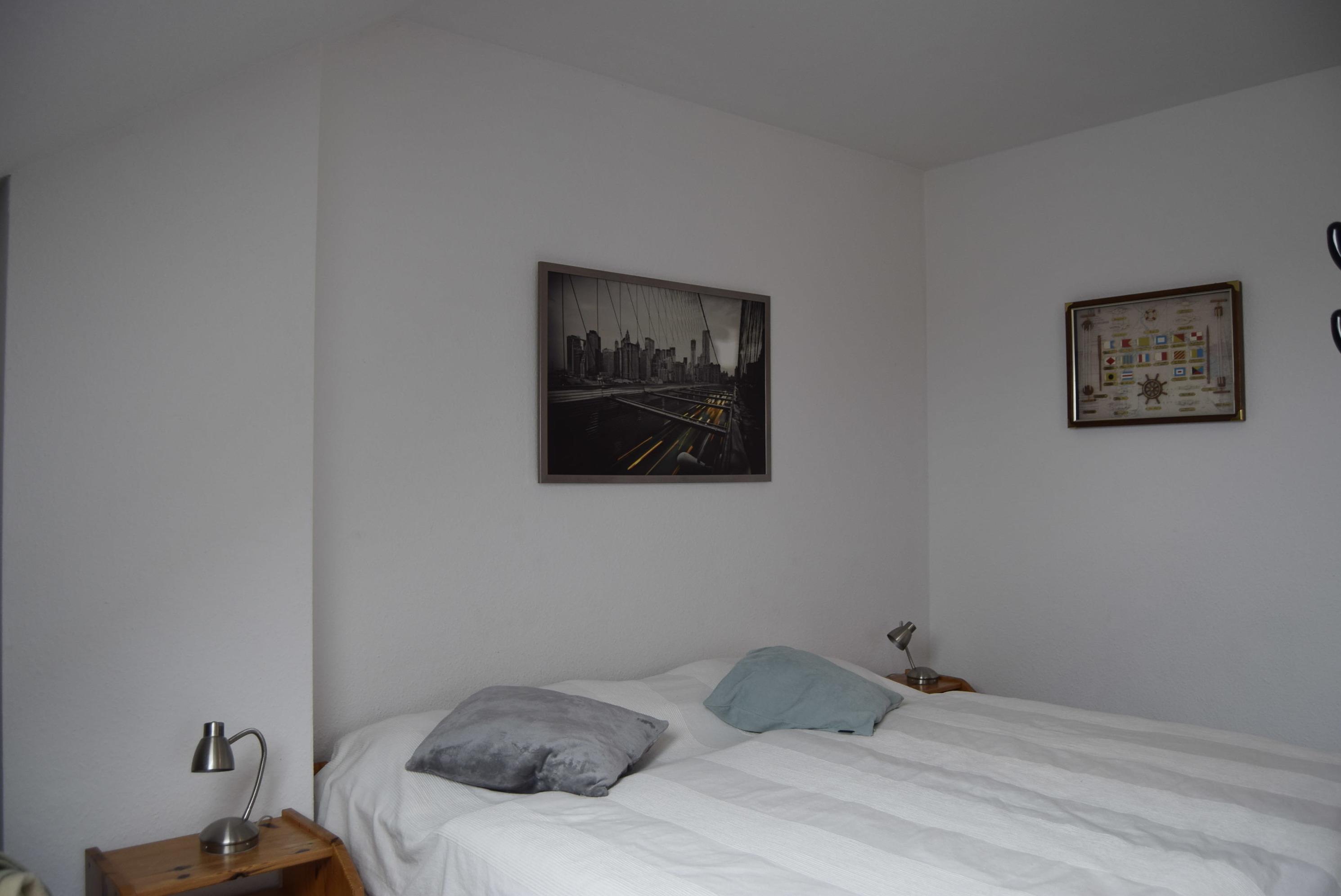 Vom Wohnbereich gelangen Sie in ein separates Schlafzimmer mit einem Doppelbett. Das Bad ist zweckmäßig ausgestattet mit großzügiger Duschkabine, Waschbecken und Toilette.