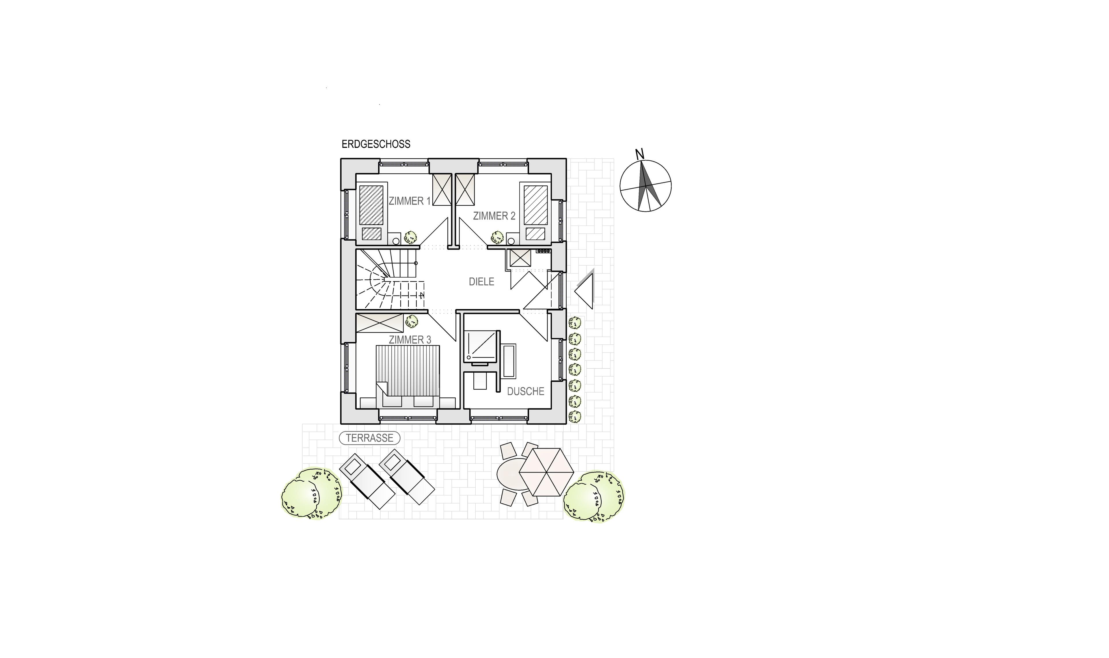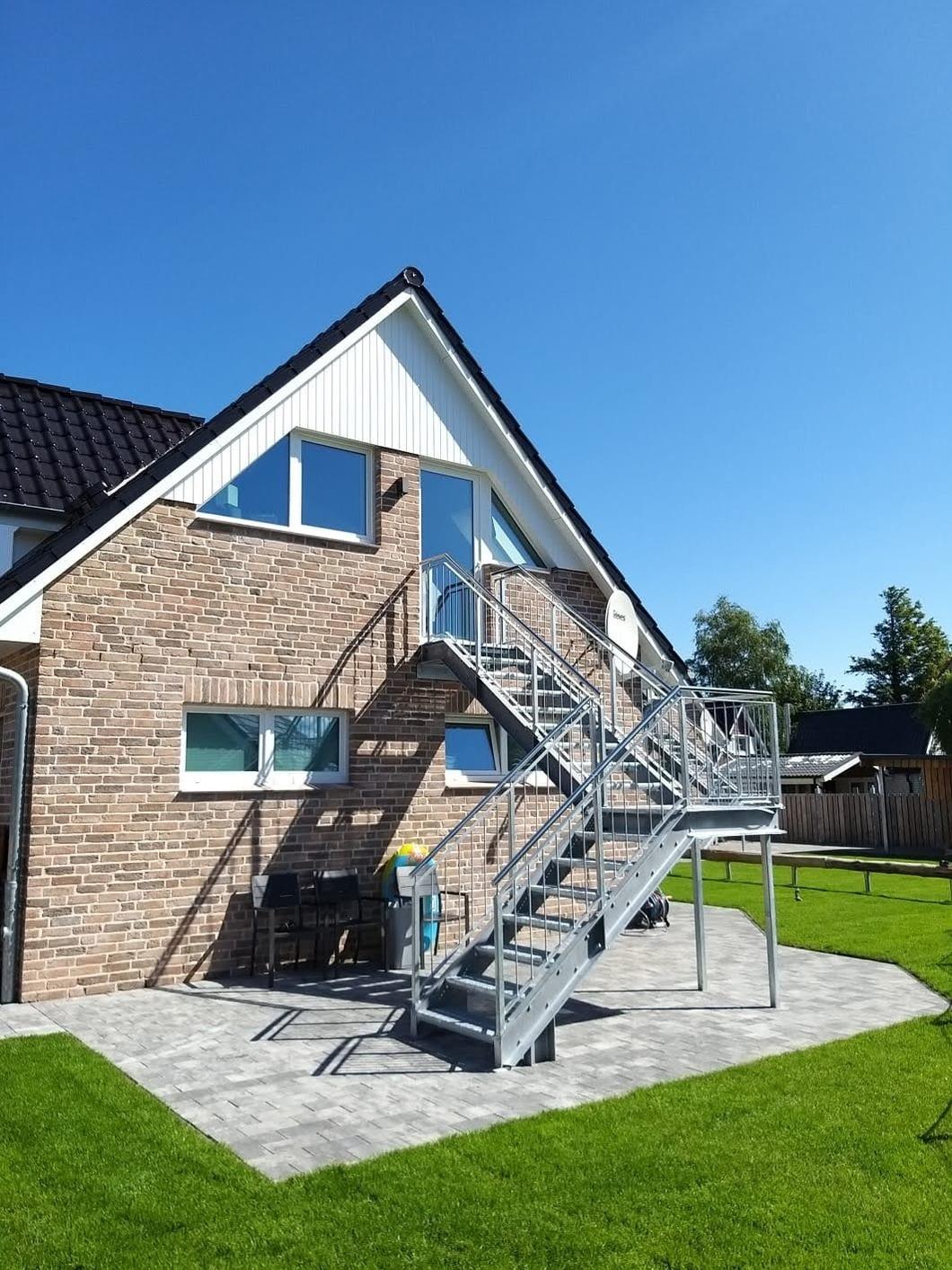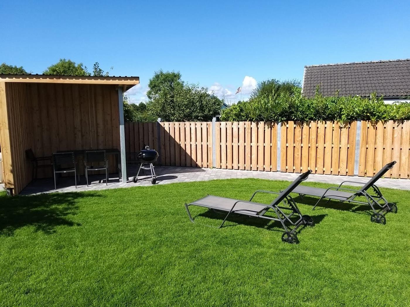 Vom Obergeschoß führt eine Außentreppe direkt in den ruhigen Garten. Hier können entspannt die Füße hochgelegt werden oder Spiele auf dem Rasen für Abwechslung sorgen. Auf der Terrasse stehen Gartenmöbel sowie zwei Sonnenliegen, ein Sonnenschirm und ein Kohlegrill bereit um den Tag genüsslich ausklingen zu lassen.