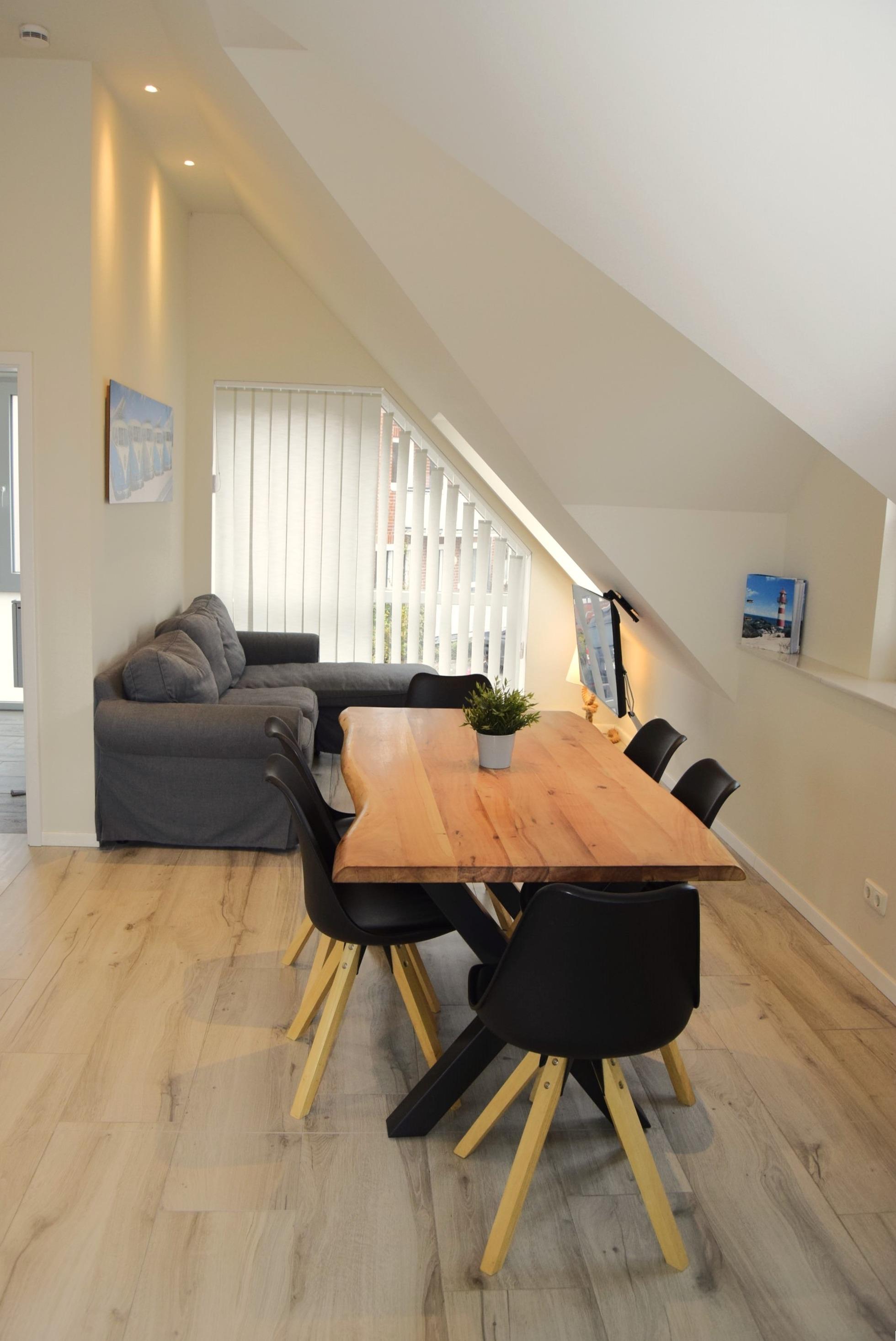 In unserem schönen Ferienhaus "Haus Kaptain" direkt hinter dem Deich ist das die tägliche Erholung. Die großen Fenster sorgen für ein lichtdurchflutetes Obergeschoss mit Wohnzimmer, Essbereich und offener Küche für geselliges Beisammensein.