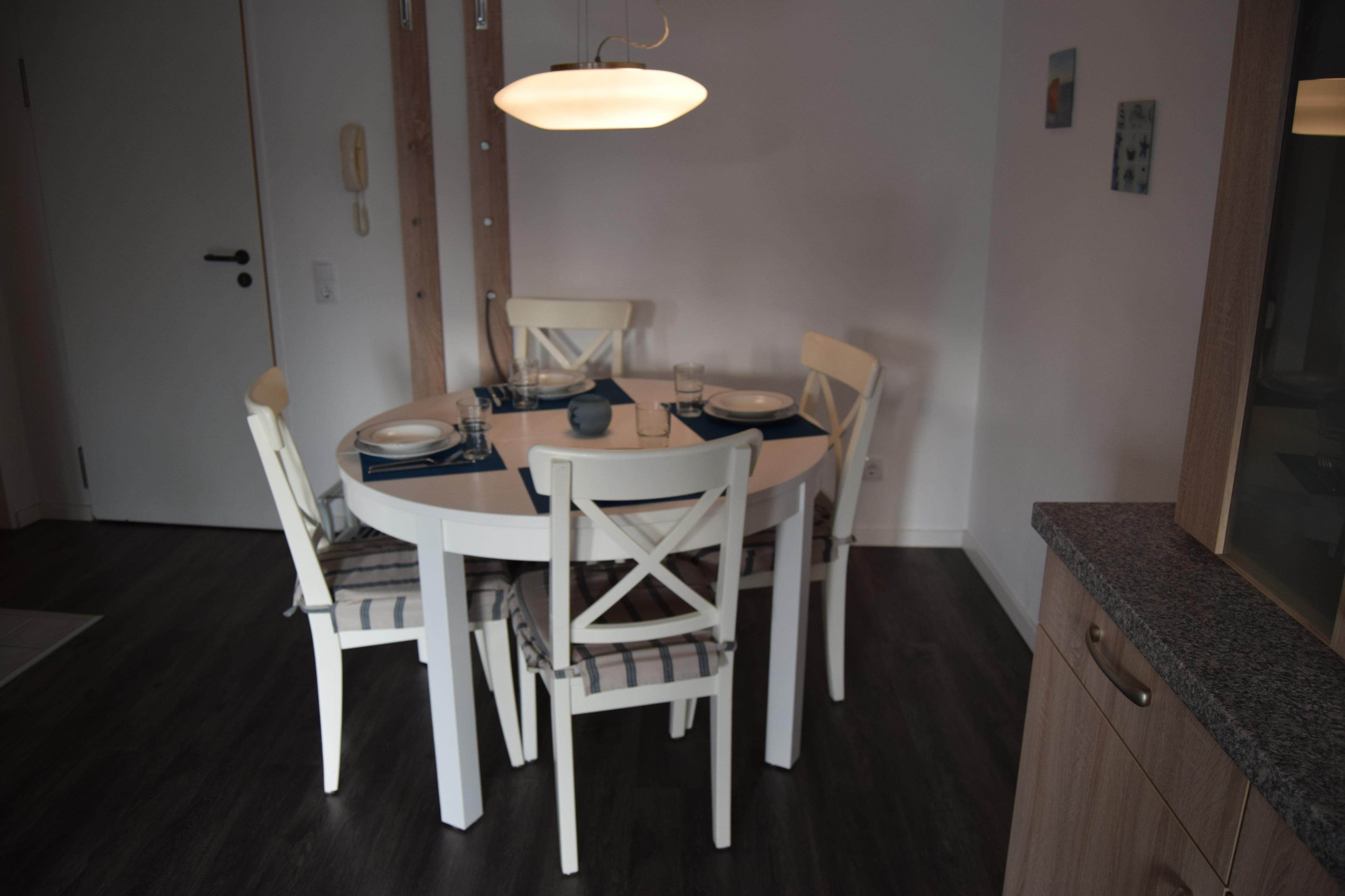 Das Wohnzimmer ist mit einem bequemen L-förmigen Sofa sowie mit einem modernen Glastisch ausgestattet. Selbstverständlich finden Sie einen modernen LCD Full HD Fernseher mit Blu-ray-Player und eine BlueTooth-fähige Kompaktstereoanlage mit CD-Fach vor. Ein runder, bei Bedarf ausziehbarer Esstisch mit vier Stühlen bietet Ihnen Platz für ein gemütliches Essen.